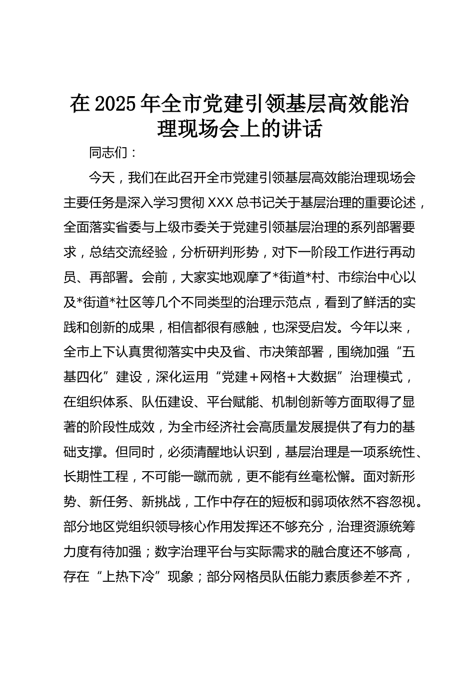 在2025年全市黨建引領基層高效能治理現(xiàn)場會上的講話