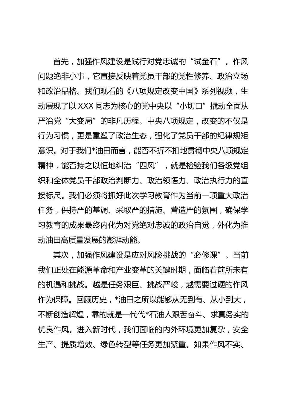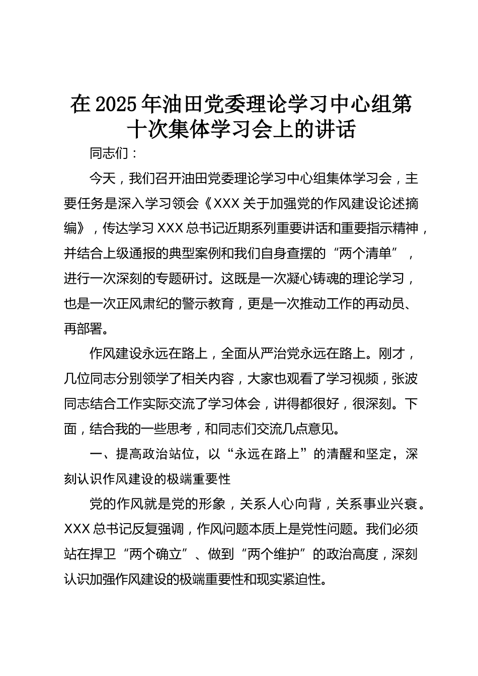 在2025年油田黨委理論學習中心組第十次集體學習會上的講話同志們:今天,我們召開油田黨委理論學習中心組集體學習會,主要任務是深入學習領會《XXX關于加強黨的作風建設論述摘編》,傳達學習XXX總書記近期系列重要講話和重要指示精神,并結合上級通報的典型案例和我們自身查擺的“兩個清單”,進行一次深刻的專題研討。這既是一次凝心鑄魂的理論學習,也是一次正風肅紀的警示教育,更是一次推動工作的再動員、再部署。作風建設永遠在路上,全面從嚴治黨永遠在路上。剛才,幾位同志分別領學了相關內容,大家也觀看了學習視頻,張波同志結合工作實際交流了學習體會,講得都...