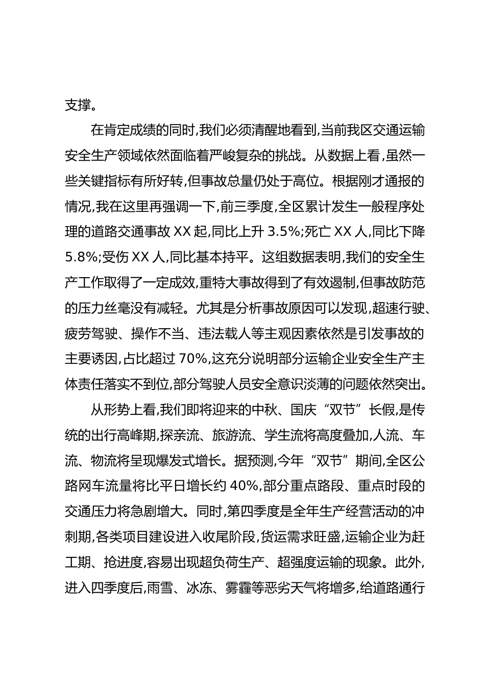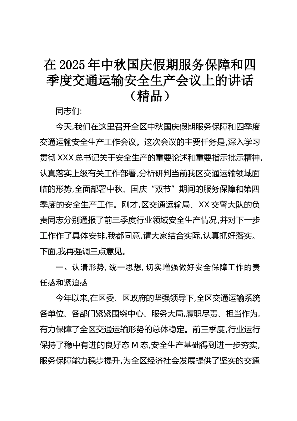 在2025年中秋國(guó)慶假期服務(wù)保障和四季度交通運(yùn)輸安全生產(chǎn)會(huì)議上的講話(精品)同志們:今天,我們?cè)谶@里召開全區(qū)中秋國(guó)慶假期服務(wù)保障和四季度交通運(yùn)輸安全生產(chǎn)工作會(huì)議。這次會(huì)議的主要任務(wù)是,深入學(xué)習(xí)貫徹XXX總書記關(guān)于安全生產(chǎn)的重要論述和重要指示批示精神,認(rèn)真落實(shí)上級(jí)有關(guān)工作部署,分析研判當(dāng)前我區(qū)交通運(yùn)輸領(lǐng)域面臨的形勢(shì),全面部署中秋、國(guó)慶“雙節(jié)”期間的服務(wù)保障和第四季度的安全生產(chǎn)工作。剛才,區(qū)交通運(yùn)輸局、XX交警大隊(duì)的負(fù)責(zé)同志分別通報(bào)了前三季度行業(yè)領(lǐng)域安全生產(chǎn)情況,并對(duì)下一步工作作了具體安排,我都同意,請(qǐng)大家結(jié)合實(shí)際,認(rèn)真抓好落實(shí)。下面,我再?gòu)?qiáng)調(diào)三點(diǎn)...