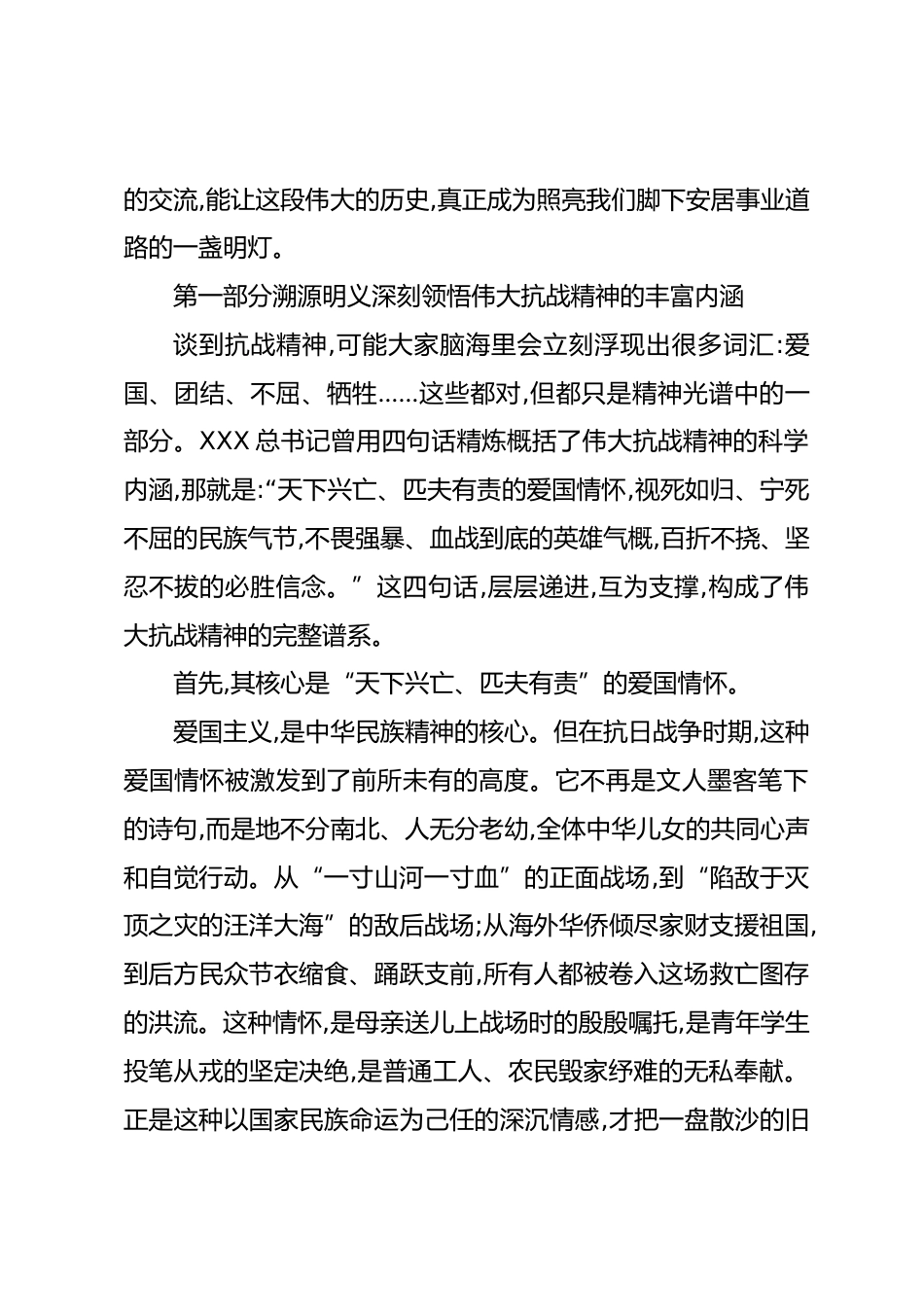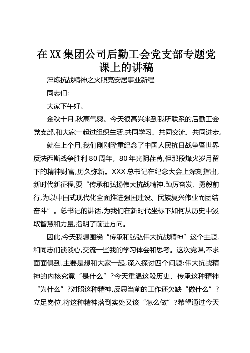 在XX集團(tuán)公司后勤工會(huì)黨支部專題黨課上的講稿淬煉抗戰(zhàn)精神之火照亮安居事業(yè)新程同志們:大家下午好。金秋十月,秋高氣爽。今天很高興來到我所聯(lián)系的后勤工會(huì)黨支部,和大家一起過組織生活,共同學(xué)習(xí)、共同交流、共同進(jìn)步。就在上個(gè)月,我們剛剛隆重紀(jì)念了中國人民抗日戰(zhàn)爭暨世界反法西斯戰(zhàn)爭勝利80周年。80年光陰荏苒,但那段烽火歲月留下的精神財(cái)富,歷久彌新。XXX總書記在紀(jì)念大會(huì)上深刻指出,新時(shí)代新征程,要“傳承和弘揚(yáng)偉大抗戰(zhàn)精神,踔厲奮發(fā)、勇毅前行,為以中國式現(xiàn)代化全面推進(jìn)強(qiáng)國建設(shè)、民族復(fù)興偉業(yè)而團(tuán)結(jié)奮斗”??倳浀闹v話,為我們?cè)谛聲r(shí)代坐標(biāo)下如何從歷史中汲取智...