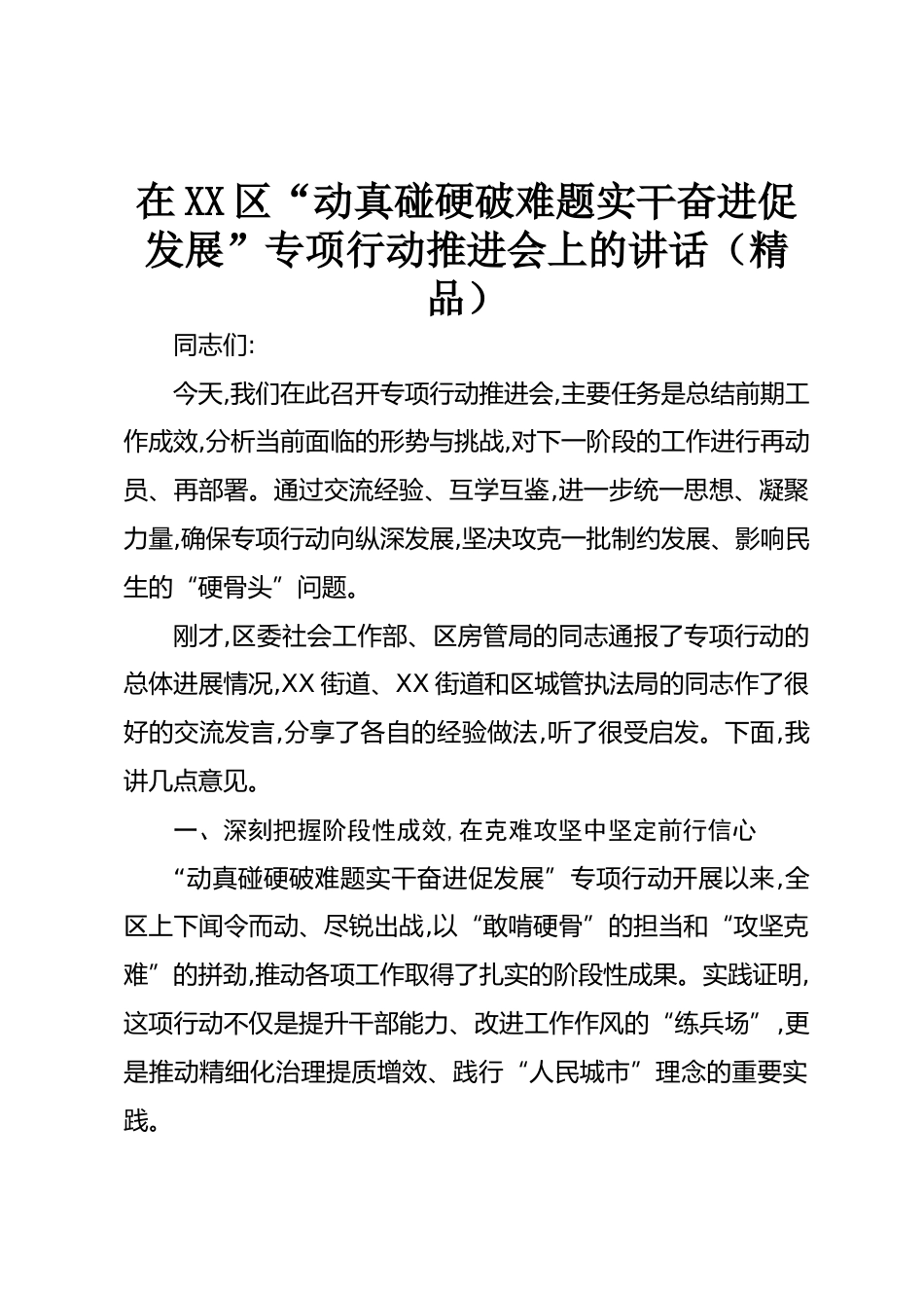 在XX區(qū)“動(dòng)真碰硬破難題實(shí)干奮進(jìn)促發(fā)展”專項(xiàng)行動(dòng)推進(jìn)會(huì)上的講話(精品)