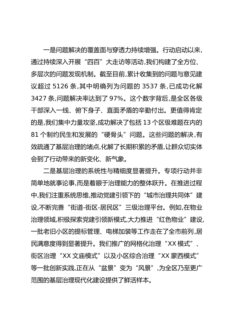 在XX區(qū)“動(dòng)真碰硬破難題實(shí)干奮進(jìn)促發(fā)展”專項(xiàng)行動(dòng)推進(jìn)會(huì)上的講話(精品)同志們:今天,我們在此召開專項(xiàng)行動(dòng)推進(jìn)會(huì),主要任務(wù)是總結(jié)前期工作成效,分析當(dāng)前面臨的形勢與挑戰(zhàn),對下一階段的工作進(jìn)行再動(dòng)員、再部署。通過交流經(jīng)驗(yàn)、互學(xué)互鑒,進(jìn)一步統(tǒng)一思想、凝聚力量,確保專項(xiàng)行動(dòng)向縱深發(fā)展,堅(jiān)決攻克一批制約發(fā)展、影響民生的“硬骨頭”問題。剛才,區(qū)委社會(huì)工作部、區(qū)房管局的同志通報(bào)了專項(xiàng)行動(dòng)的總體進(jìn)展情況,XX街道、XX街道和區(qū)城管執(zhí)法局的同志作了很好的交流發(fā)言,分享了各自的經(jīng)驗(yàn)做法,聽了很受啟發(fā)。下面,我講幾點(diǎn)意見。一、深刻把握階段性成效,在克難攻堅(jiān)中堅(jiān)定前行信...