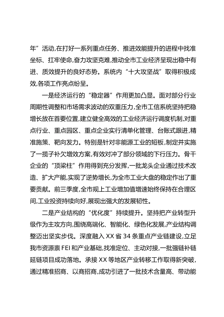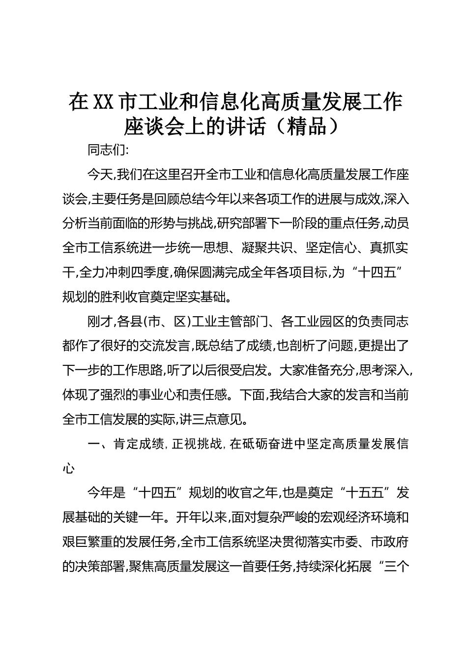 在XX市工業(yè)和信息化高質(zhì)量發(fā)展工作座談會(huì)上的講話(精品)同志們:今天,我們?cè)谶@里召開(kāi)全市工業(yè)和信息化高質(zhì)量發(fā)展工作座談會(huì),主要任務(wù)是回顧總結(jié)今年以來(lái)各項(xiàng)工作的進(jìn)展與成效,深入分析當(dāng)前面臨的形勢(shì)與挑戰(zhàn),研究部署下一階段的重點(diǎn)任務(wù),動(dòng)員全市工信系統(tǒng)進(jìn)一步統(tǒng)一思想、凝聚共識(shí)、堅(jiān)定信心、真抓實(shí)干,全力沖刺四季度,確保圓滿完成全年各項(xiàng)目標(biāo),為“十四五”規(guī)劃的勝利收官奠定堅(jiān)實(shí)基礎(chǔ)。剛才,各縣(市、區(qū))工業(yè)主管部門、各工業(yè)園區(qū)的負(fù)責(zé)同志都作了很好的交流發(fā)言,既總結(jié)了成績(jī),也剖析了問(wèn)題,更提出了下一步的工作思路,聽(tīng)了以后很受啟發(fā)。大家準(zhǔn)備充分,思考深入,體現(xiàn)了...