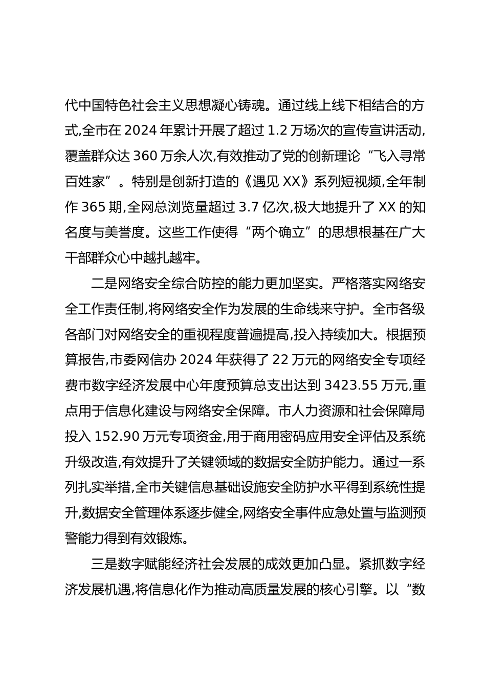 在XX市委網(wǎng)絡(luò)安全和信息化委員會會議上的講話(精品)同志們:今天,我們召開市委網(wǎng)絡(luò)安全和信息化委員會會議,主要任務(wù)是深入學(xué)習(xí)貫徹XXX總書記關(guān)于網(wǎng)絡(luò)強(qiáng)國的重要思想,認(rèn)真落實(shí)中央和省委關(guān)于網(wǎng)信工作的最新會議精神與決策部署,總結(jié)我市2024年以來的工作成效,分析當(dāng)前面臨的新形勢新挑戰(zhàn),研究部署下一階段的重點(diǎn)任務(wù)。目的就是要進(jìn)一步統(tǒng)一思想、凝聚共識、壓實(shí)責(zé)任,以更高站位、更大力度、更實(shí)舉措,奮力開創(chuàng)全市網(wǎng)信事業(yè)高質(zhì)量發(fā)展新局面,為在開創(chuàng)XX省發(fā)展新篇章中譜寫XX新篇章提供堅(jiān)強(qiáng)的網(wǎng)絡(luò)安全保障和有力的信息化支撐。下面,我講幾點(diǎn)意見。一、肯定成績總結(jié)經(jīng)驗(yàn)在服務(wù)...