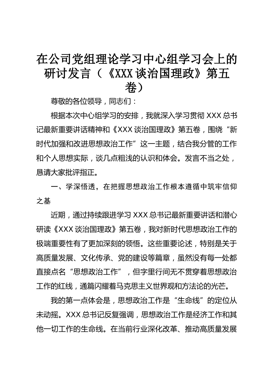 在公司黨組理論學(xué)習(xí)中心組學(xué)習(xí)會(huì)上的研討發(fā)言(《XXX談治國理政》第五卷)尊敬的各位領(lǐng)導(dǎo),同志們:根據(jù)本次中心組學(xué)習(xí)的安排,我就深入學(xué)習(xí)貫徹XXX總書記最新重要講話精神和《XXX談治國理政》第五卷,圍繞“新時(shí)代加強(qiáng)和改進(jìn)思想政治工作”這一主題,結(jié)合我分管的工作和個(gè)人思想實(shí)際,談幾點(diǎn)粗淺的認(rèn)識(shí)和體會(huì)。發(fā)言不當(dāng)之處,懇請(qǐng)大家批評(píng)指正。一、學(xué)深悟透,在把握思想政治工作根本遵循中筑牢信仰之基近期,通過持續(xù)跟進(jìn)學(xué)習(xí)XXX總書記最新重要講話和潛心研讀《XXX談治國理政》第五卷,我對(duì)新時(shí)代思想政治工作的極端重要性有了更加深刻的領(lǐng)悟。這些重要論述,特別是關(guān)...