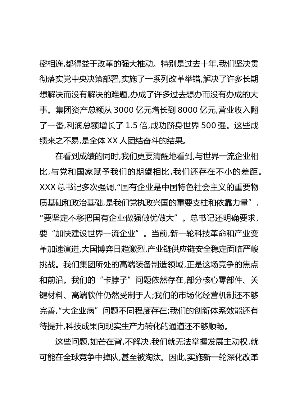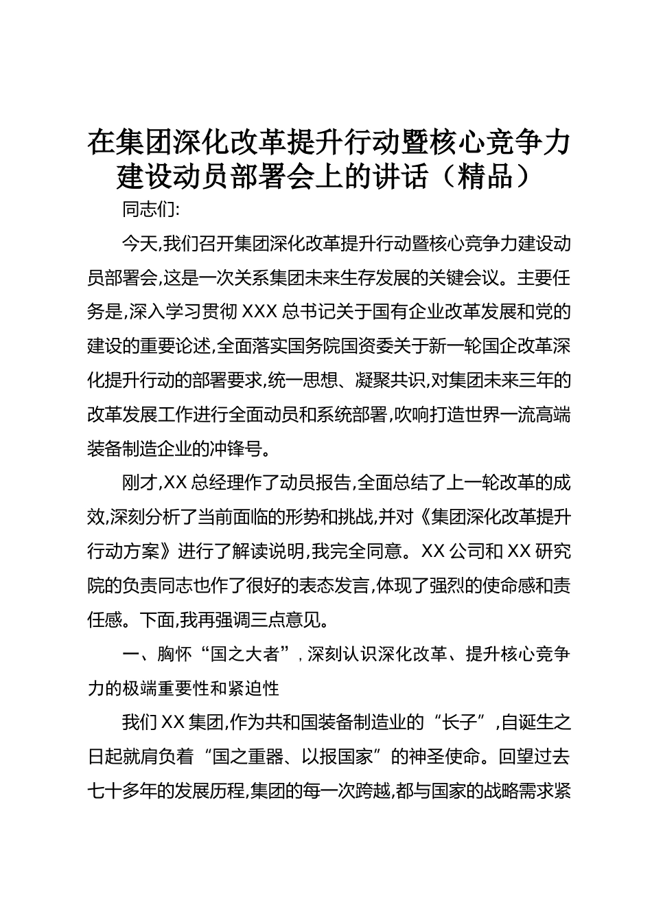 在集團(tuán)深化改革提升行動(dòng)暨核心競(jìng)爭(zhēng)力建設(shè)動(dòng)員部署會(huì)上的講話(精品)同志們:今天,我們召開(kāi)集團(tuán)深化改革提升行動(dòng)暨核心競(jìng)爭(zhēng)力建設(shè)動(dòng)員部署會(huì),這是一次關(guān)系集團(tuán)未來(lái)生存發(fā)展的關(guān)鍵會(huì)議。主要任務(wù)是,深入學(xué)習(xí)貫徹XXX總書(shū)記關(guān)于國(guó)有企業(yè)改革發(fā)展和黨的建設(shè)的重要論述,全面落實(shí)國(guó)務(wù)院國(guó)資委關(guān)于新一輪國(guó)企改革深化提升行動(dòng)的部署要求,統(tǒng)一思想、凝聚共識(shí),對(duì)集團(tuán)未來(lái)三年的改革發(fā)展工作進(jìn)行全面動(dòng)員和系統(tǒng)部署,吹響打造世界一流高端裝備制造企業(yè)的沖鋒號(hào)。剛才,XX總經(jīng)理作了動(dòng)員報(bào)告,全面總結(jié)了上一輪改革的成效,深刻分析了當(dāng)前面臨的形勢(shì)和挑戰(zhàn),并對(duì)《集團(tuán)深化改革提升行動(dòng)方...