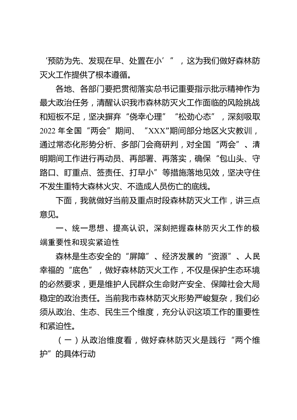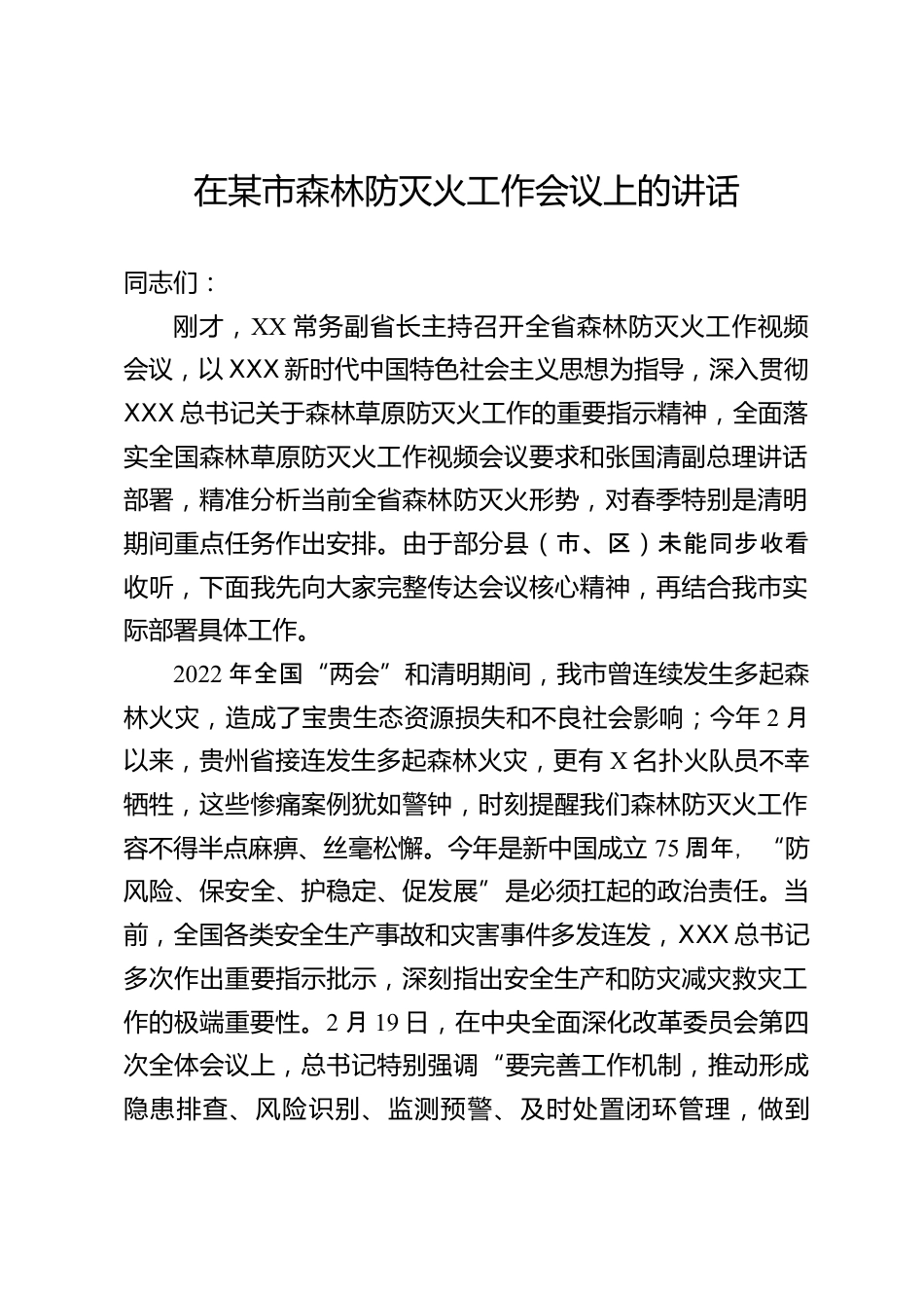 在某市森林防滅火工作會(huì)議上的講話同志們:剛才,XX常務(wù)副省長主持召開全省森林防滅火工作視頻會(huì)議,以XXX新時(shí)代中國特色社會(huì)主義思想為指導(dǎo),深入貫徹XXX總書記關(guān)于森林草原防滅火工作的重要指示精神,全面落實(shí)全國森林草原防滅火工作視頻會(huì)議要求和張國清副總理講話部署,精準(zhǔn)分析當(dāng)前全省森林防滅火形勢(shì),對(duì)春季特別是清明期間重點(diǎn)任務(wù)作出安排。由于部分縣(市、區(qū))未能同步收看收聽,下面我先向大家完整傳達(dá)會(huì)議核心精神,再結(jié)合我市實(shí)際部署具體工作。2022年全國“兩會(huì)”和清明期間,我市曾連續(xù)發(fā)生多起森林火災(zāi),造成了寶貴生態(tài)資源損失和不良社會(huì)影響;今年2月...