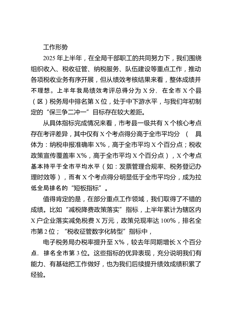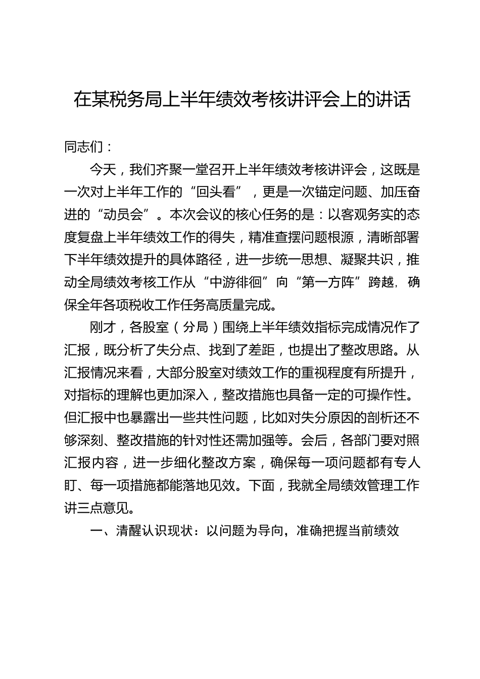 在某稅務(wù)局上半年績(jī)效考核講評(píng)會(huì)上的講話同志們:今天,我們齊聚一堂召開上半年績(jī)效考核講評(píng)會(huì),這既是一次對(duì)上半年工作的“回頭看”,更是一次錨定問題、加壓奮進(jìn)的“動(dòng)員會(huì)”。本次會(huì)議的核心任務(wù)的是:以客觀務(wù)實(shí)的態(tài)度復(fù)盤上半年績(jī)效工作的得失,精準(zhǔn)查擺問題根源,清晰部署下半年績(jī)效提升的具體路徑,進(jìn)一步統(tǒng)一思想、凝聚共識(shí),推動(dòng)全局績(jī)效考核工作從“中游徘徊”向“第一方陣”跨越,確保全年各項(xiàng)稅收工作任務(wù)高質(zhì)量完成。剛才,各股室(分局)圍繞上半年績(jī)效指標(biāo)完成情況作了匯報(bào),既分析了失分點(diǎn)、找到了差距,也提出了整改思路。從匯報(bào)情況來看,大部分股室對(duì)...