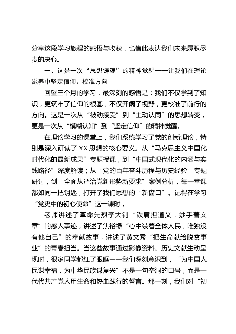 在青年干部培訓(xùn)班結(jié)業(yè)典禮上的學(xué)員代表發(fā)言尊敬的各位領(lǐng)導(dǎo)、各位老師,親愛的同學(xué)們:大家好!當(dāng)清晨的第一縷陽光透過黨校教學(xué)樓的窗戶,灑在“青年干部培訓(xùn)班”的橫幅上時(shí),我們忽然意識到,為期三個(gè)月的學(xué)習(xí)時(shí)光,即將畫上圓滿的句號。此刻,站在這里作為學(xué)員代表發(fā)言,我的心中既有收獲知識的喜悅,也有即將分別的不舍,更有肩負(fù)使命的堅(jiān)定。首先,請?jiān)试S我代表全體學(xué)員,向始終關(guān)心支持培訓(xùn)班的各位領(lǐng)導(dǎo)致以最誠摯的感謝——是你們的重視與投入,為我們搭建了成長的階梯;向辛勤付出的各位老師致以最崇高的敬意——是你們的悉心教導(dǎo)與無私奉獻(xiàn),為我們點(diǎn)亮了思想的明...