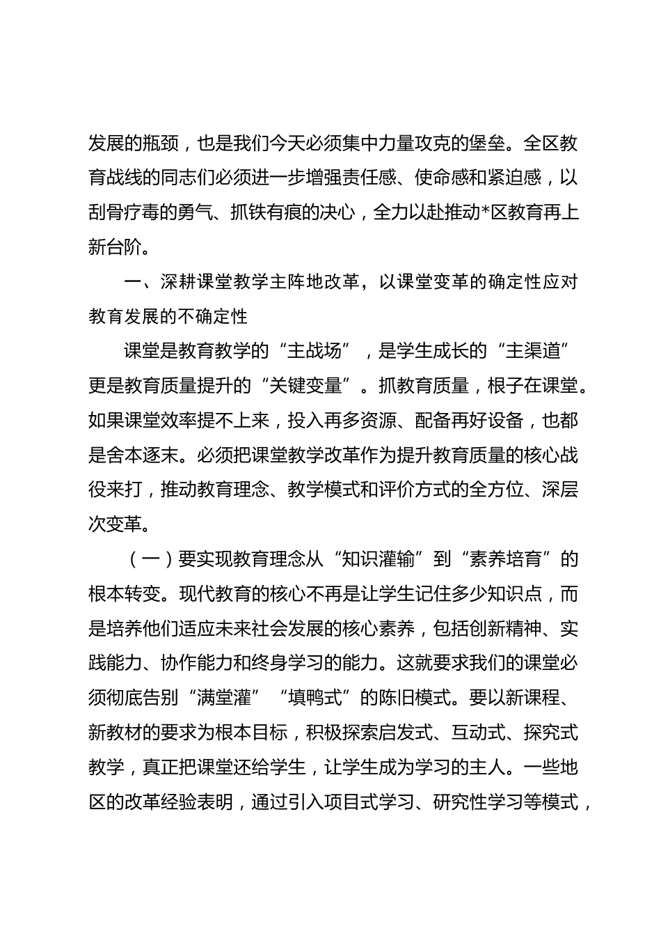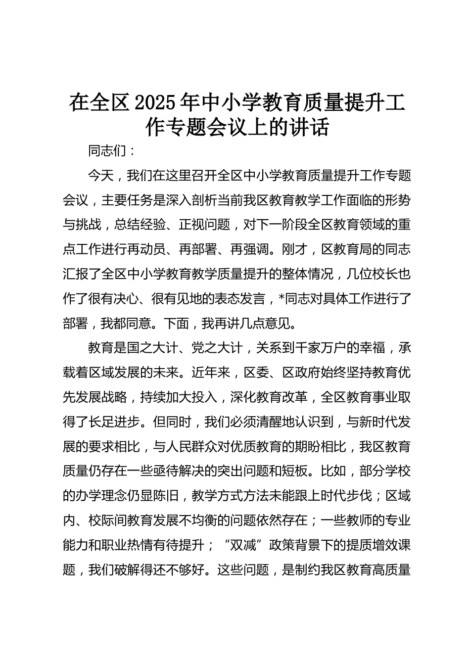 在全區(qū)2025年中小學教育質量提升工作專題會議上的講話同志們:今天,我們在這里召開全區(qū)中小學教育質量提升工作專題會議,主要任務是深入剖析當前我區(qū)教育教學工作面臨的形勢與挑戰(zhàn),總結經驗、正視問題,對下一階段全區(qū)教育領域的重點工作進行再動員、再部署、再強調。剛才,區(qū)教育局的同志匯報了全區(qū)中小學教育教學質量提升的整體情況,幾位校長也作了很有決心、很有見地的表態(tài)發(fā)言,*同志對具體工作進行了部署,我都同意。下面,我再講幾點意見。教育是國之大計、黨之大計,關系到千家萬戶的幸福,承載著區(qū)域發(fā)展的未來。近年來,區(qū)委、區(qū)政府始終堅持教育優(yōu)先發(fā)展戰(zhàn)...