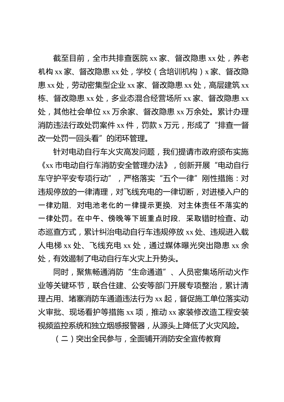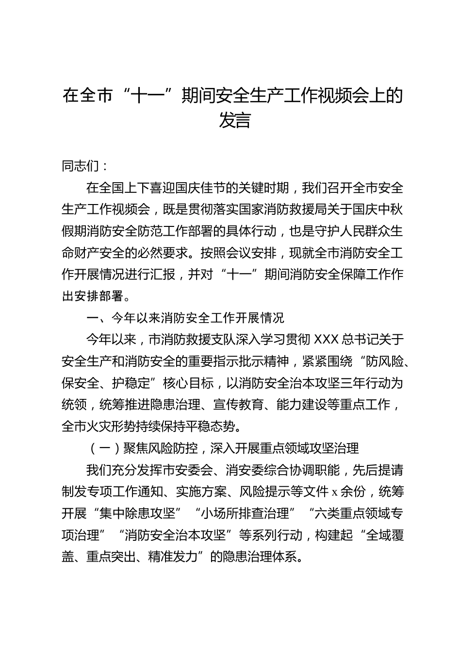 在全市“十一”期間安全生產(chǎn)工作視頻會上的發(fā)言同志們:在全國上下喜迎國慶佳節(jié)的關(guān)鍵時期,我們召開全市安全生產(chǎn)工作視頻會,既是貫徹落實國家消防救援局關(guān)于國慶中秋假期消防安全防范工作部署的具體行動,也是守護人民群眾生命財產(chǎn)安全的必然要求。按照會議安排,現(xiàn)就全市消防安全工作開展情況進行匯報,并對“十一”期間消防安全保障工作作出安排部署。一、今年以來消防安全工作開展情況今年以來,市消防救援支隊深入學習貫徹XXX總書記關(guān)于安全生產(chǎn)和消防安全的重要指示批示精神,緊緊圍繞“防風險、保安全、護穩(wěn)定”核心目標,以消防安全治本攻堅三年行動為統(tǒng)領(lǐng),統(tǒng)...