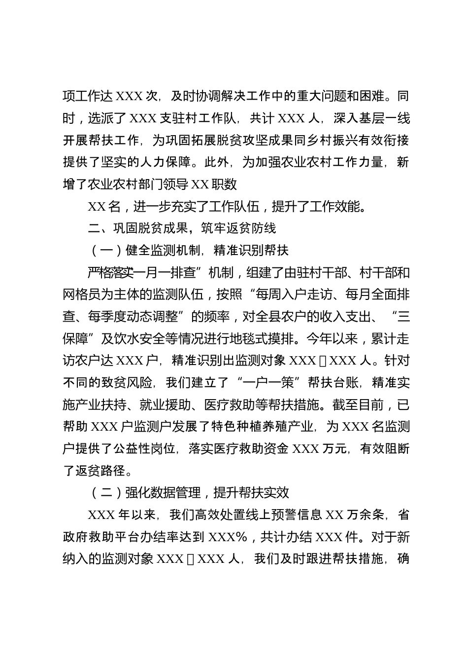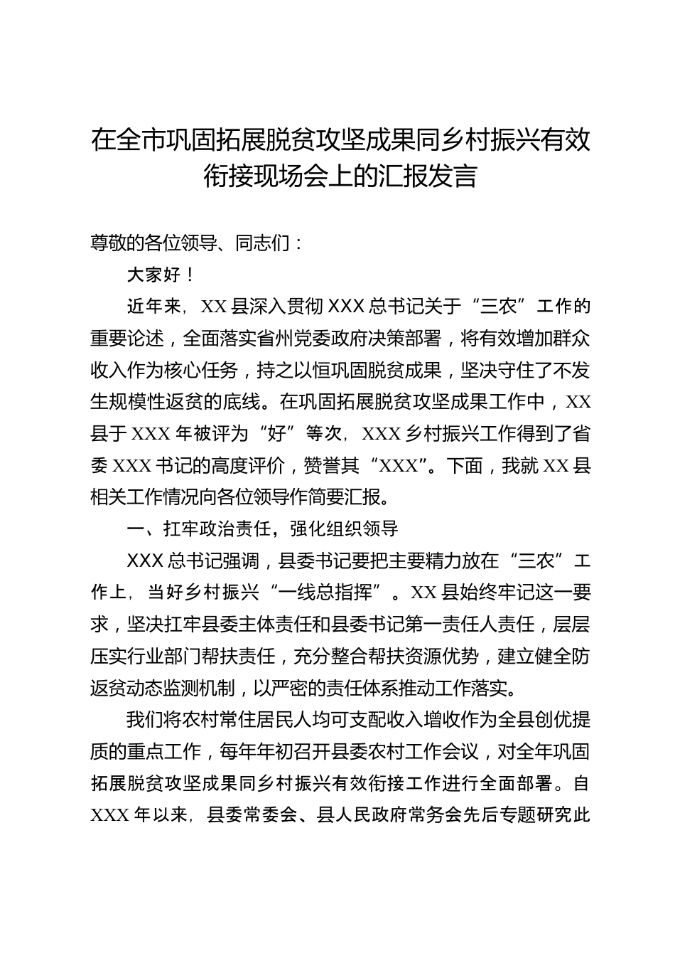 在全市鞏固拓展脫貧攻堅(jiān)成果同鄉(xiāng)村振興有效銜接現(xiàn)場會(huì)上的匯報(bào)發(fā)言尊敬的各位領(lǐng)導(dǎo)、同志們:大家好!近年來,XX縣深入貫徹XXX總書記關(guān)于“三農(nóng)”工作的重要論述,全面落實(shí)省州黨委政府決策部署,將有效增加群眾收入作為核心任務(wù),持之以恒鞏固脫貧成果,堅(jiān)決守住了不發(fā)生規(guī)模性返貧的底線。在鞏固拓展脫貧攻堅(jiān)成果工作中,XX縣于XXX年被評(píng)為“好”等次,XXX鄉(xiāng)村振興工作得到了省委XXX書記的高度評(píng)價(jià),贊譽(yù)其“XXX”。下面,我就XX縣相關(guān)工作情況向各位領(lǐng)導(dǎo)作簡要匯報(bào)。一、扛牢政治責(zé)任,強(qiáng)化組織領(lǐng)導(dǎo)XXX總書記強(qiáng)調(diào),縣委書記要把主要精力放在“三農(nóng)”工作上,當(dāng)好鄉(xiāng)村振...