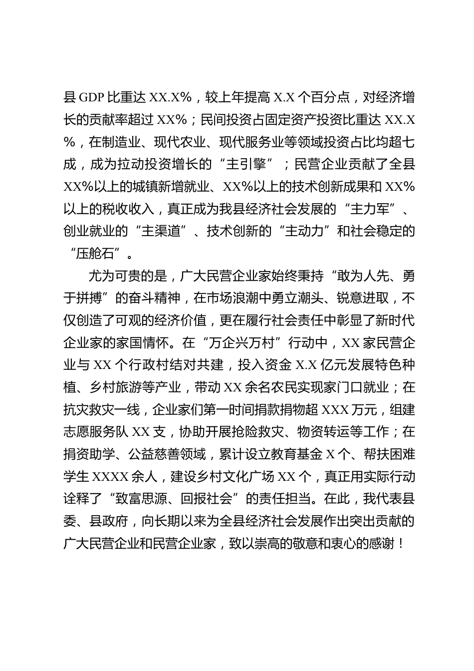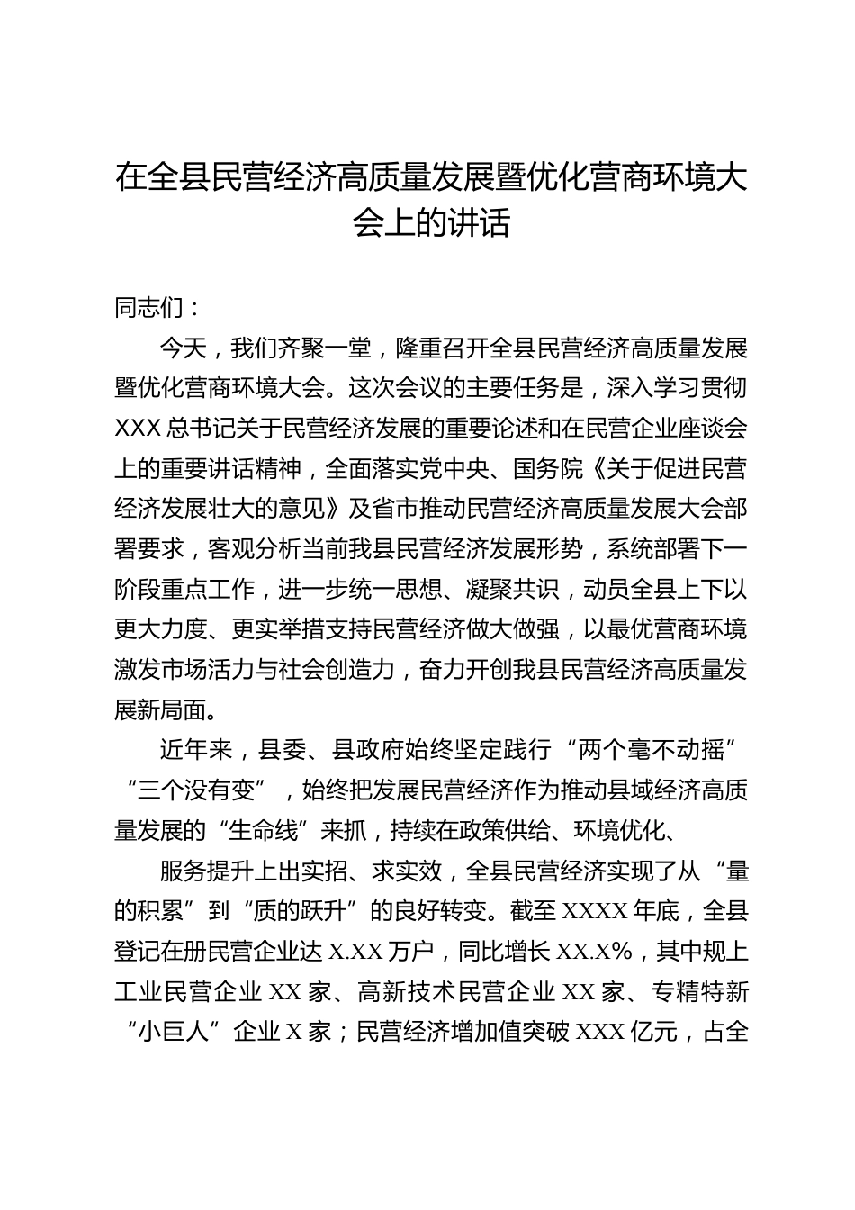 在全縣民營(yíng)經(jīng)濟(jì)高質(zhì)量發(fā)展暨優(yōu)化營(yíng)商環(huán)境大會(huì)上的講話同志們:今天,我們齊聚一堂,隆重召開(kāi)全縣民營(yíng)經(jīng)濟(jì)高質(zhì)量發(fā)展暨優(yōu)化營(yíng)商環(huán)境大會(huì)。這次會(huì)議的主要任務(wù)是,深入學(xué)習(xí)貫徹XXX總書(shū)記關(guān)于民營(yíng)經(jīng)濟(jì)發(fā)展的重要論述和在民營(yíng)企業(yè)座談會(huì)上的重要講話精神,全面落實(shí)黨中央、國(guó)務(wù)院《關(guān)于促進(jìn)民營(yíng)經(jīng)濟(jì)發(fā)展壯大的意見(jiàn)》及省市推動(dòng)民營(yíng)經(jīng)濟(jì)高質(zhì)量發(fā)展大會(huì)部署要求,客觀分析當(dāng)前我縣民營(yíng)經(jīng)濟(jì)發(fā)展形勢(shì),系統(tǒng)部署下一階段重點(diǎn)工作,進(jìn)一步統(tǒng)一思想、凝聚共識(shí),動(dòng)員全縣上下以更大力度、更實(shí)舉措支持民營(yíng)經(jīng)濟(jì)做大做強(qiáng),以最優(yōu)營(yíng)商環(huán)境激發(fā)市場(chǎng)活力與社會(huì)創(chuàng)造力,奮力開(kāi)創(chuàng)我縣民營(yíng)經(jīng)...