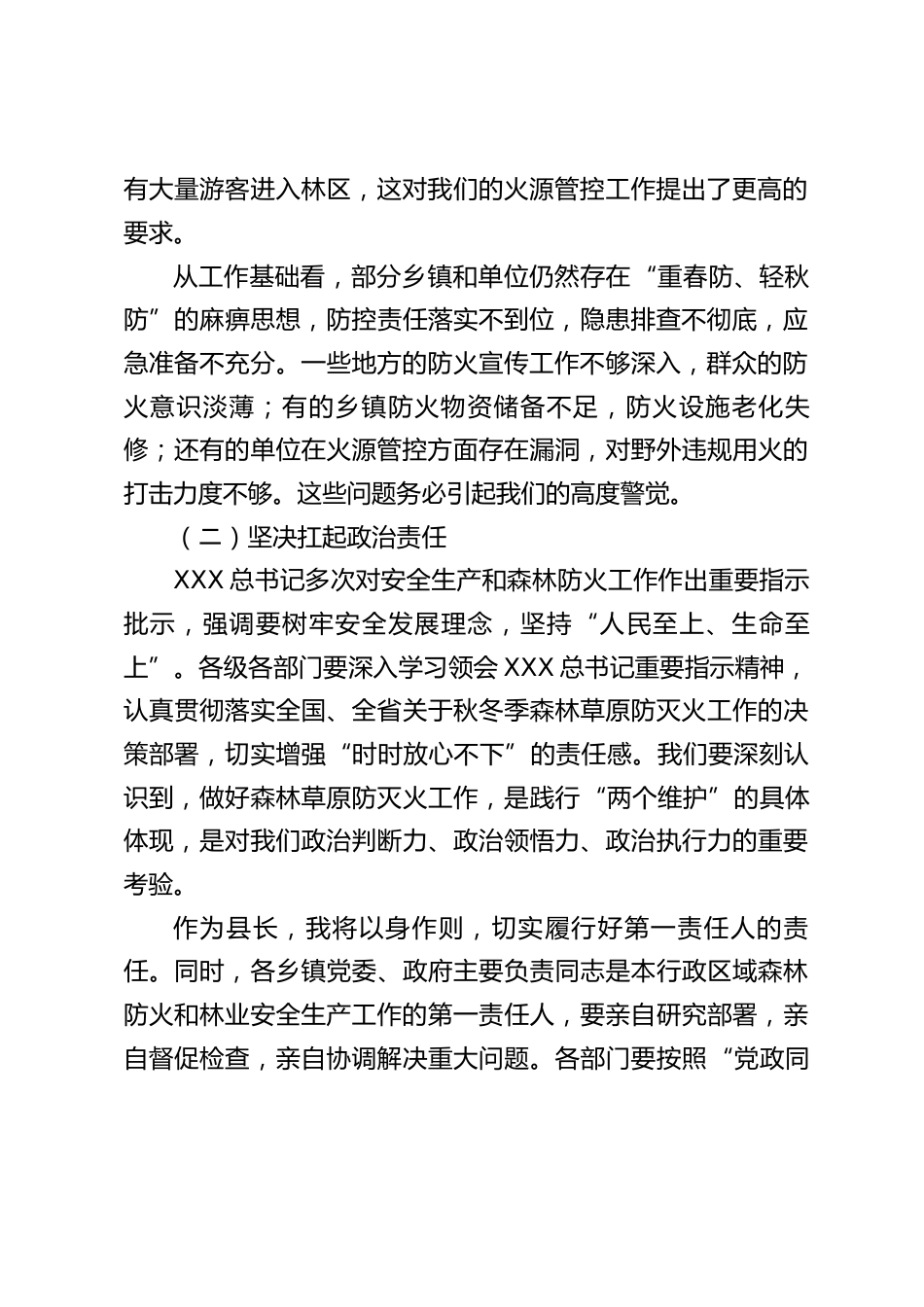 在全縣秋冬季森林草原防滅火電視電話會議上的講話同志們:今天,我們召開全縣秋冬季森林草原防滅火電視電話會議,主要任務(wù)是傳達全國全省秋冬季森林草原防滅火會議精神,分析當(dāng)前面臨的嚴(yán)峻形勢,部署秋冬季森林草原防滅火工作。剛才,縣應(yīng)急局、林業(yè)局通報了有關(guān)情況,幾個鄉(xiāng)鎮(zhèn)作了表態(tài)發(fā)言,講得都很好。下面,我講幾點意見。一、提高政治站位,充分認識森林防滅火的極端重要性森林資源是生態(tài)文明建設(shè)的重要基礎(chǔ),森林防火和林業(yè)安全生產(chǎn)事關(guān)人民群眾生命財產(chǎn)安全,事關(guān)生態(tài)安全大局,事關(guān)社會和諧穩(wěn)定。近期,全國各地相繼進入秋冬季防火期,森林火險等級持續(xù)攀升,防...