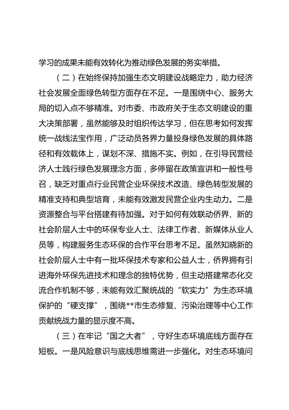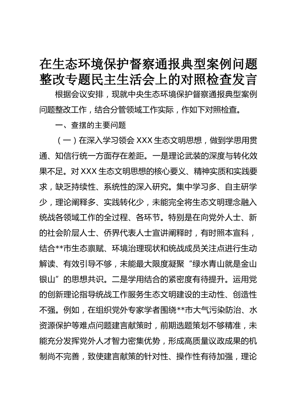 在生態(tài)環(huán)境保護督察通報典型案例問題整改專題民主生活會上的對照檢查發(fā)言根據(jù)會議安排,現(xiàn)就中央生態(tài)環(huán)境保護督察通報典型案例問題整改工作,結(jié)合分管領(lǐng)域工作實際,作如下對照檢查。一、查擺的主要問題(一)在深入學習領(lǐng)會XXX生態(tài)文明思想,做到學思用貫通、知信行統(tǒng)一方面存在差距。一是理論武裝的深度與轉(zhuǎn)化效果不足。對XXX生態(tài)文明思想的核心要義、精神實質(zhì)和實踐要求,缺乏持續(xù)性、系統(tǒng)性的深入研究。集中學習多、自主研學少,理論闡釋多、實踐轉(zhuǎn)化少,未能完全將生態(tài)文明理念融入統(tǒng)戰(zhàn)各領(lǐng)域工作的全過程、各環(huán)節(jié)。特別是在向黨外人士、新的社會階層人士、僑界代表...