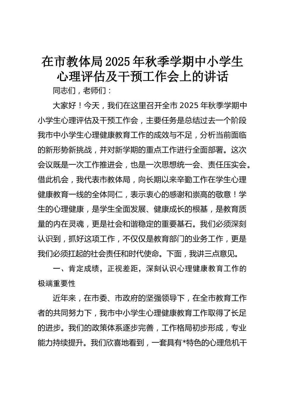 在市教體局2025年秋季學(xué)期中小學(xué)生心理評(píng)估及干預(yù)工作會(huì)上的講話