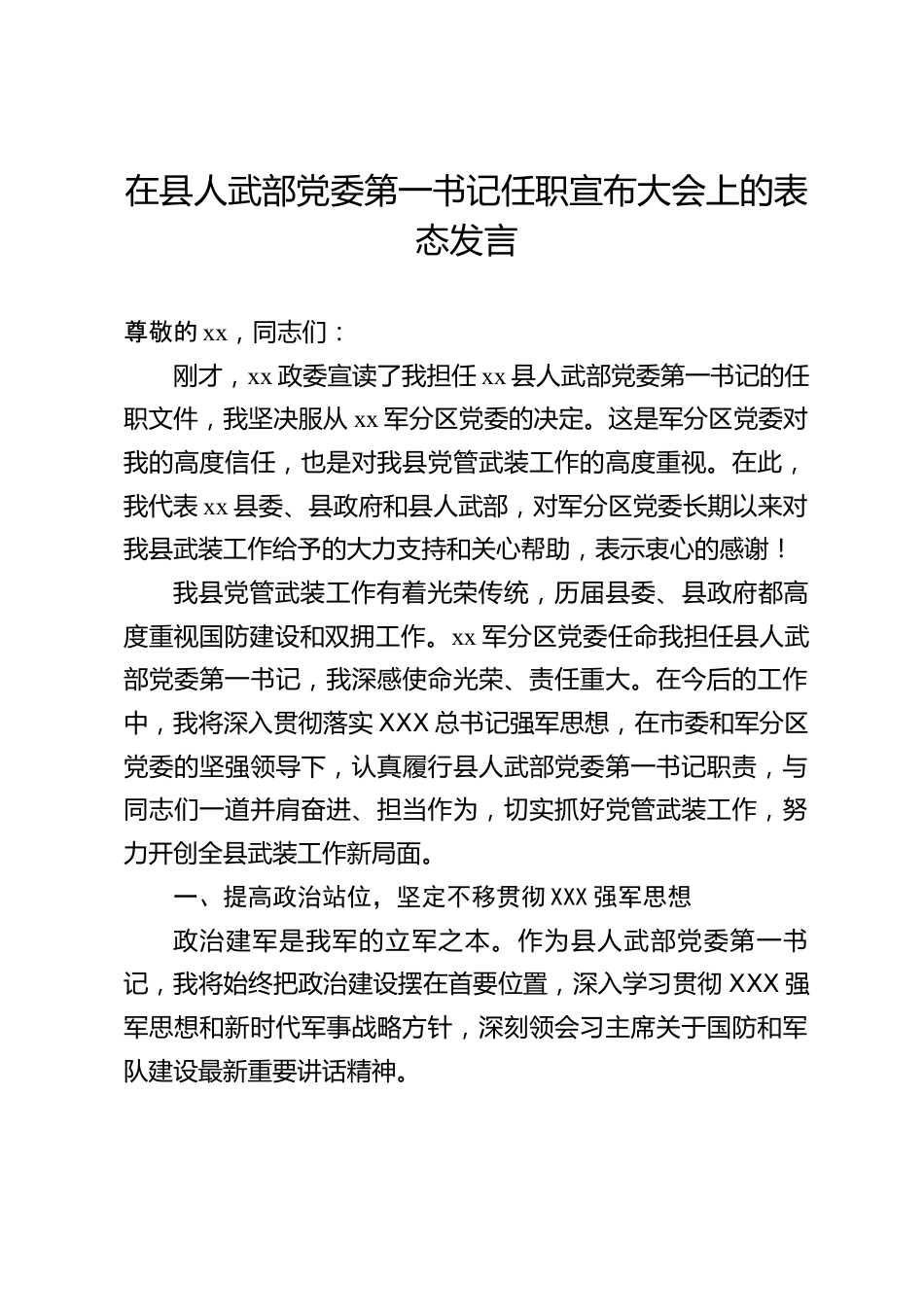 在縣人武部黨委第一書記任職宣布大會(huì)上的表態(tài)發(fā)言尊敬的xx,同志們:剛才,xx政委宣讀了我擔(dān)任xx縣人武部黨委第一書記的任職文件,我堅(jiān)決服從xx軍分區(qū)黨委的決定。這是軍分區(qū)黨委對我的高度信任,也是對我縣黨管武裝工作的高度重視。在此,我代表xx縣委、縣政府和縣人武部,對軍分區(qū)黨委長期以來對我縣武裝工作給予的大力支持和關(guān)心幫助,表示衷心的感謝!我縣黨管武裝工作有著光榮傳統(tǒng),歷屆縣委、縣政府都高度重視國防建設(shè)和雙擁工作。xx軍分區(qū)黨委任命我擔(dān)任縣人武部黨委第一書記,我深感使命光榮、責(zé)任重大。在今后的工作中,我將深入貫徹落實(shí)XXX總書記強(qiáng)軍思想,在...