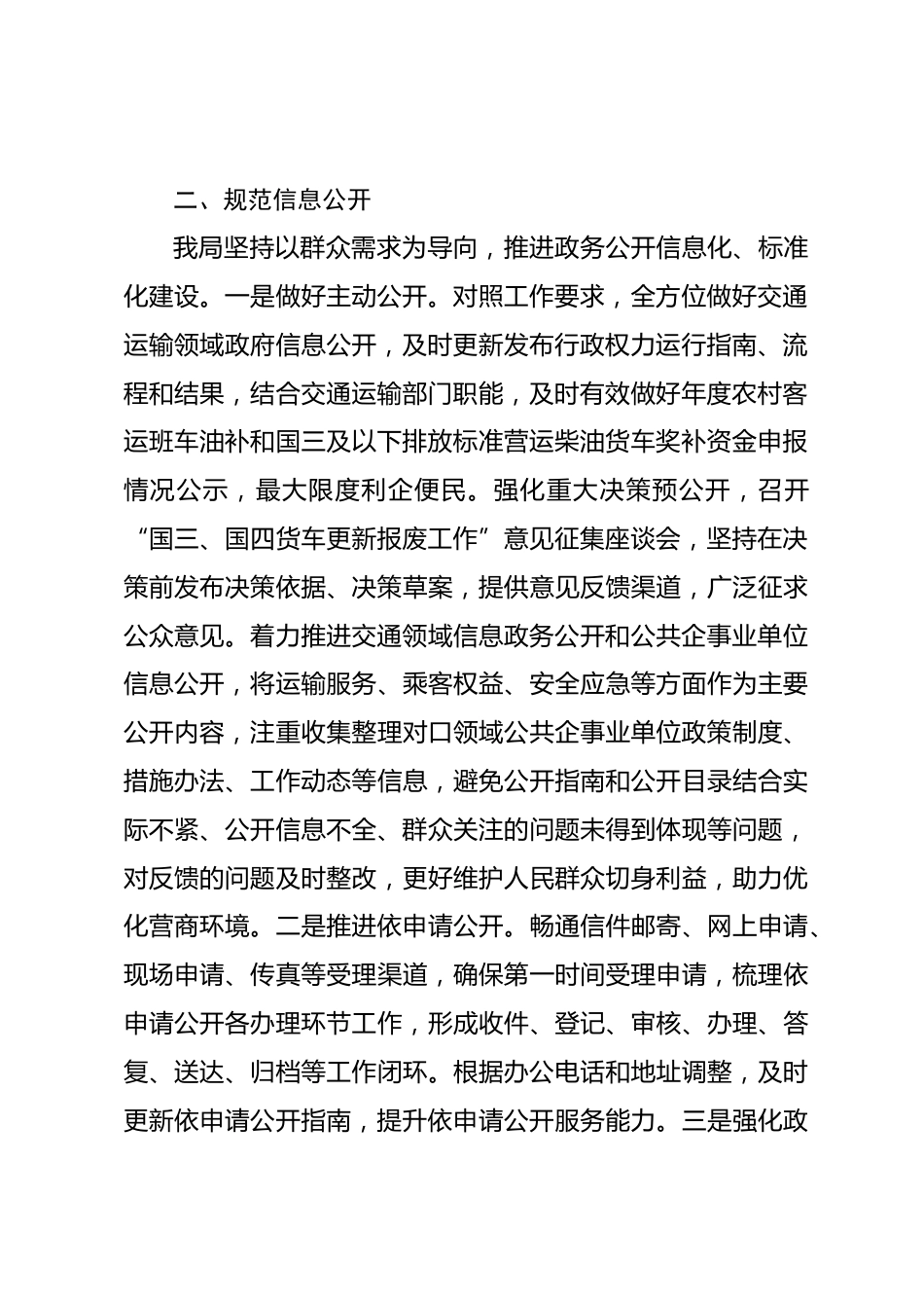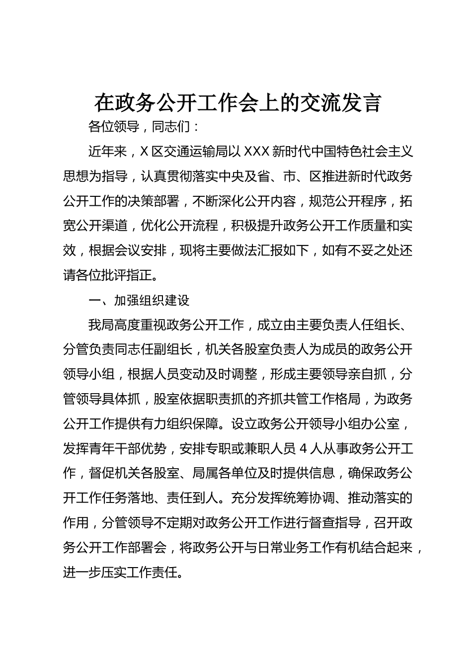 在政務(wù)公開工作會(huì)上的交流發(fā)言各位領(lǐng)導(dǎo),同志們:近年來,X區(qū)交通運(yùn)輸局以XXX新時(shí)代中國特色社會(huì)主義思想為指導(dǎo),認(rèn)真貫徹落實(shí)中央及省、市、區(qū)推進(jìn)新時(shí)代政務(wù)公開工作的決策部署,不斷深化公開內(nèi)容,規(guī)范公開程序,拓寬公開渠道,優(yōu)化公開流程,積極提升政務(wù)公開工作質(zhì)量和實(shí)效,根據(jù)會(huì)議安排,現(xiàn)將主要做法匯報(bào)如下,如有不妥之處還請各位批評指正。一、加強(qiáng)組織建設(shè)我局高度重視政務(wù)公開工作,成立由主要負(fù)責(zé)人任組長、分管負(fù)責(zé)同志任副組長,機(jī)關(guān)各股室負(fù)責(zé)人為成員的政務(wù)公開領(lǐng)導(dǎo)小組,根據(jù)人員變動(dòng)及時(shí)調(diào)整,形成主要領(lǐng)導(dǎo)親自抓,分管領(lǐng)導(dǎo)具體抓,股室依據(jù)職責(zé)抓的...