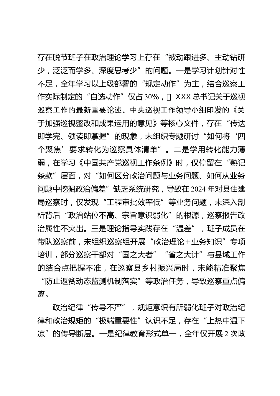 中共XX縣委巡察辦班子民主生活會對照檢查材料根據(jù)中央、省委、州委和縣委關(guān)于開好民主生活會的部署要求,中共XX縣委巡察辦班子緊扣“以學鑄魂、以學增智、以學正風、以學促干”主題,聚焦“強化政治擔當、提升巡察質(zhì)效、服務(wù)發(fā)展大局”目標任務(wù),嚴格對照黨的政治紀律、組織紀律、廉潔紀律、群眾紀律、工作紀律、生活紀律要求,圍繞“帶頭嚴守政治紀律和政治規(guī)矩,維護黨的團結(jié)統(tǒng)一;帶頭增強黨性、嚴守紀律、砥礪作風;帶頭在遵規(guī)守紀、清正廉潔前提下勇于擔責、敢于創(chuàng)新;帶頭履行全面從嚴治黨政治責任”4個方面,結(jié)合主題教育以來未完成的整改問題、征求意見和談心談...