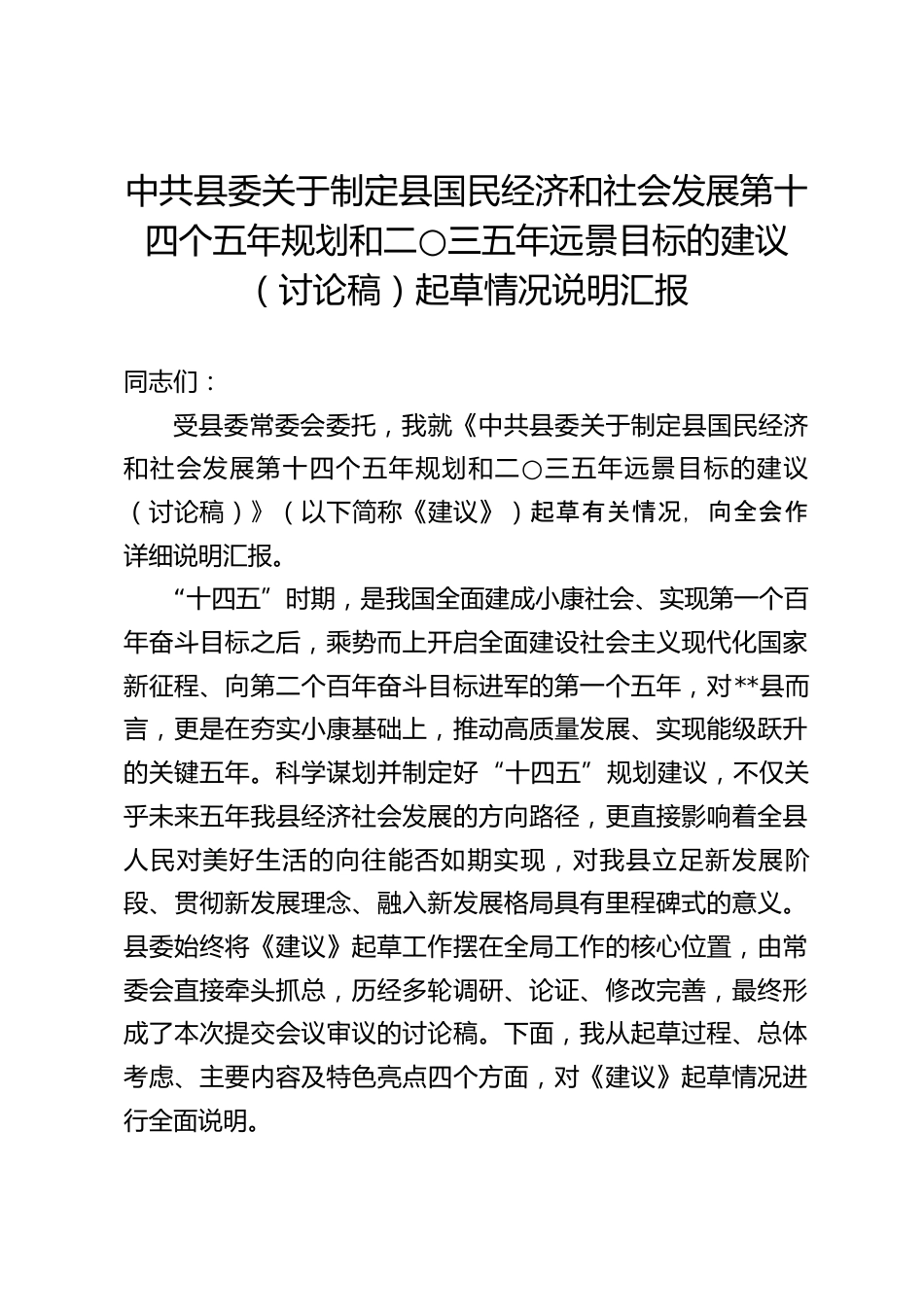 中共縣委關(guān)于制定縣國(guó)民經(jīng)濟(jì)和社會(huì)發(fā)展第十四個(gè)五年規(guī)劃和二○三五年遠(yuǎn)景目標(biāo)的建議(討論稿)起草情況說明匯報(bào)同志們:受縣委常委會(huì)委托,我就《中共縣委關(guān)于制定縣國(guó)民經(jīng)濟(jì)和社會(huì)發(fā)展第十四個(gè)五年規(guī)劃和二○三五年遠(yuǎn)景目標(biāo)的建議(討論稿)》(以下簡(jiǎn)稱《建議》)起草有關(guān)情況,向全會(huì)作詳細(xì)說明匯報(bào)?!笆奈濉睍r(shí)期,是我國(guó)全面建成小康社會(huì)、實(shí)現(xiàn)第一個(gè)百年奮斗目標(biāo)之后,乘勢(shì)而上開啟全面建設(shè)社會(huì)主義現(xiàn)代化國(guó)家新征程、向第二個(gè)百年奮斗目標(biāo)進(jìn)軍的第一個(gè)五年,對(duì)**縣而言,更是在夯實(shí)小康基礎(chǔ)上,推動(dòng)高質(zhì)量發(fā)展、實(shí)現(xiàn)能級(jí)躍升的關(guān)鍵五年??茖W(xué)謀劃并制定好“十四...