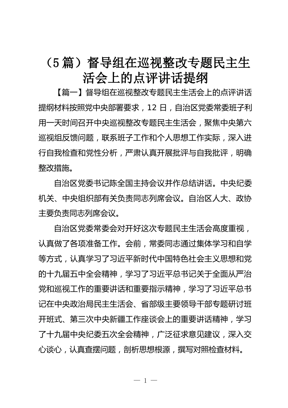 (5篇)督導(dǎo)組在巡視整改專題民主生活會(huì)上的點(diǎn)評(píng)講話提綱【篇一】督導(dǎo)組在巡視整改專題民主生活會(huì)上的點(diǎn)評(píng)講話提綱材料按照黨中央部署要求,12日,自治區(qū)黨委常委班子利用一天時(shí)間召開中央巡視整改專題民主生活會(huì),聚焦中央第六巡視組反饋問題,聯(lián)系班子工作和個(gè)人思想工作實(shí)際,深入進(jìn)行自我檢查和黨性分析,嚴(yán)肅認(rèn)真開展批評(píng)與自我批評(píng),明確整改措施。自治區(qū)黨委書記陳全國(guó)主持會(huì)議并作總結(jié)講話。中央紀(jì)委機(jī)關(guān)、中央組織部有關(guān)負(fù)責(zé)同志列席會(huì)議。自治區(qū)人大、政協(xié)主要負(fù)責(zé)同志列席會(huì)議。自治區(qū)黨委常委會(huì)對(duì)開好這次專題民主生活會(huì)高度重視,認(rèn)真做了各項(xiàng)準(zhǔn)備工作。會(huì)...