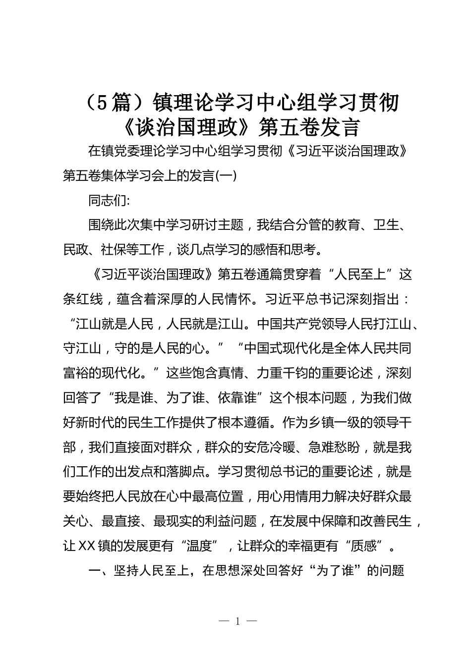 (5篇)鎮(zhèn)理論學習中心組學習貫徹《談治國理政》第五卷發(fā)言