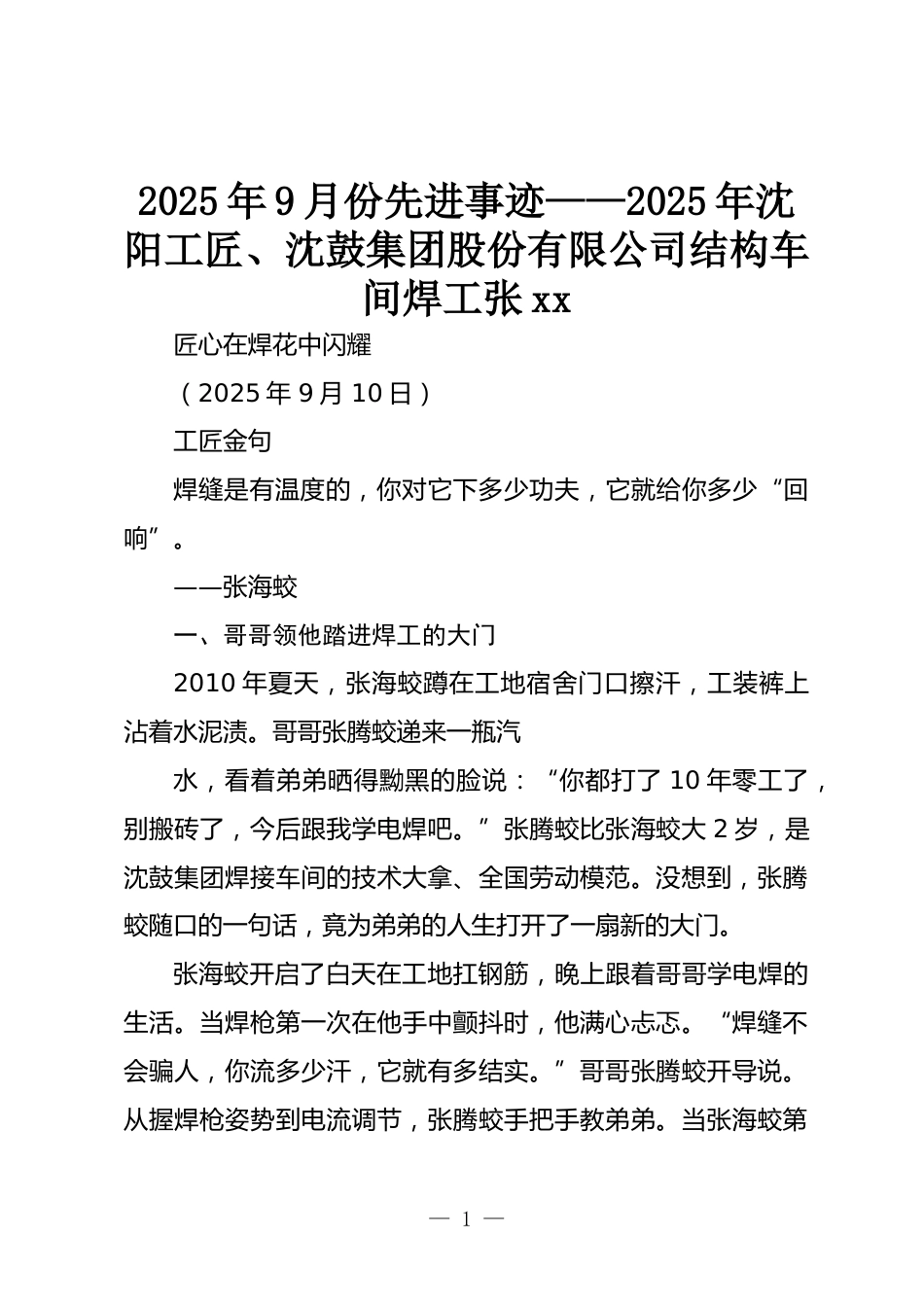 2025年9月份先進事跡——2025年沈陽工匠、沈鼓集團股份有限公司結(jié)構(gòu)車間焊工張xx匠心在焊花中閃耀(2025年9月10日)工匠金句焊縫是有溫度的,你對它下多少功夫,它就給你多少“回響”。——張海蛟一、哥哥領(lǐng)他踏進焊工的大門2010年夏天,張海蛟蹲在工地宿舍門口擦汗,工裝褲上沾著水泥漬。哥哥張騰蛟遞來一瓶汽水,看著弟弟曬得黝黑的臉說:“你都打了10年零工了,別搬磚了,今后跟我學(xué)電焊吧?!睆堯v蛟比張海蛟大2歲,是沈鼓集團焊接車間的技術(shù)大拿、全國勞動模范。沒想到,張騰蛟隨口的一句話,竟為弟弟的人生打開了一扇新的大門。張海蛟開啟了白天在工地扛鋼筋,晚上...