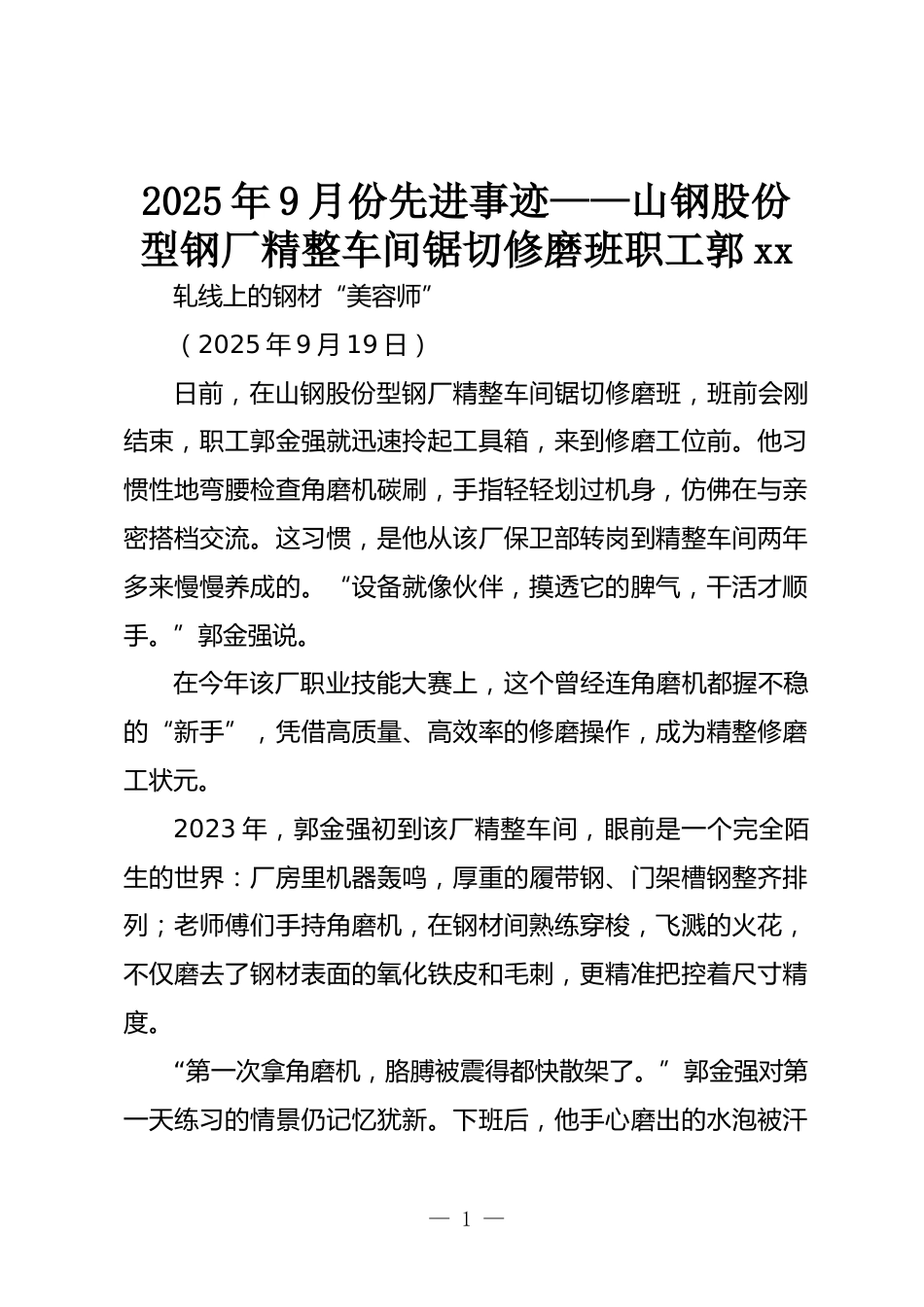 2025年9月份先進事跡——山鋼股份型鋼廠精整車間鋸切修磨班職工郭xx