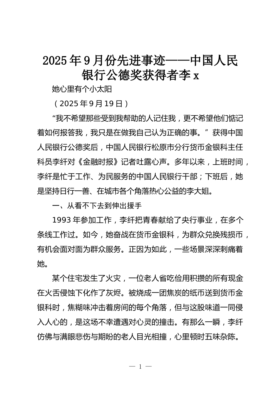 2025年9月份先進事跡——中國人民銀行公德獎獲得者李x