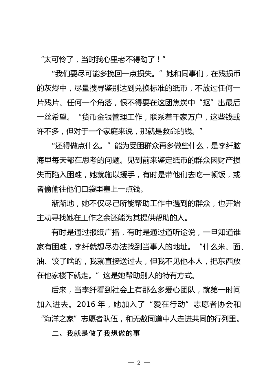 2025年9月份先進事跡——中國人民銀行公德獎獲得者李x她心里有個小太陽(2025年9月19日)“我不希望那些受到我?guī)椭娜擞涀∥?,更不希望他們惦記著如何報答我,我只是在做我自己認(rèn)為正確的事?!鲍@得中國人民銀行公德獎后,中國人民銀行松原市分行貨幣金銀科主任科員李纖對《金融時報》記者吐露心聲。多年以來,上班時間,李纖是忙于工作、為民服務(wù)的中國人民銀行干部;下班后,她是堅持日行一善、在城市各個角落熱心公益的李大姐。一、從看不下去到伸出援手1993年參加工作,李纖把青春獻給了央行事業(yè),在多個條線工作過。如今,她奮戰(zhàn)在貨幣金銀科,為群眾兌換殘損幣,...