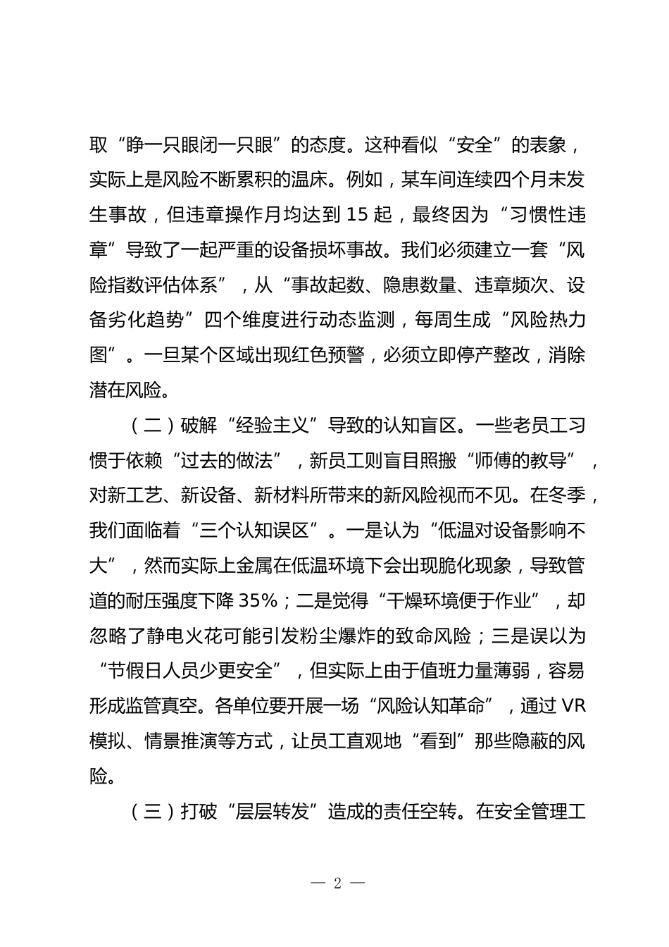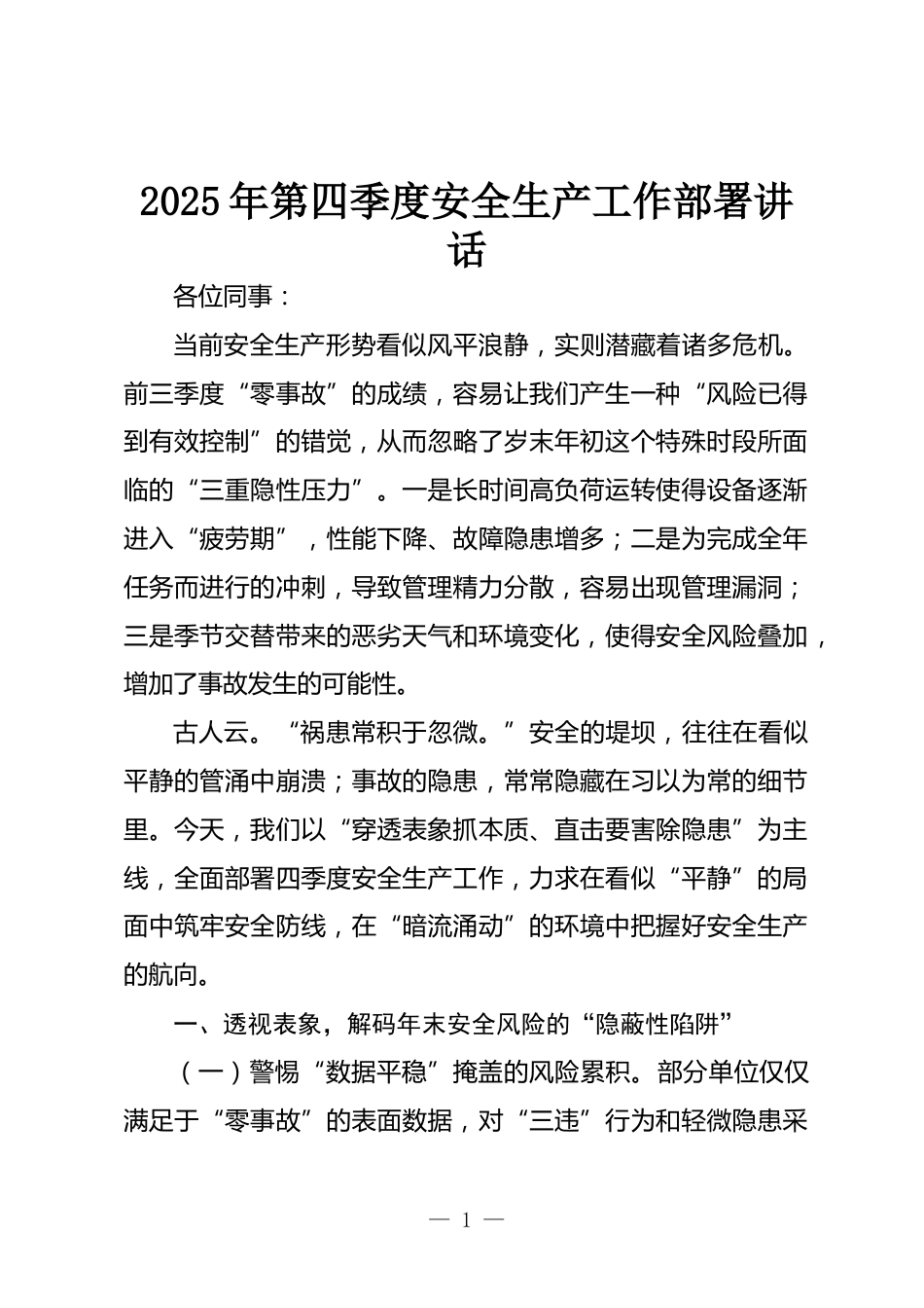 2025年第四季度安全生產(chǎn)工作部署講話各位同事:當(dāng)前安全生產(chǎn)形勢看似風(fēng)平浪靜,實(shí)則潛藏著諸多危機(jī)。前三季度“零事故”的成績,容易讓我們產(chǎn)生一種“風(fēng)險(xiǎn)已得到有效控制”的錯(cuò)覺,從而忽略了歲末年初這個(gè)特殊時(shí)段所面臨的“三重隱性壓力”。一是長時(shí)間高負(fù)荷運(yùn)轉(zhuǎn)使得設(shè)備逐漸進(jìn)入“疲勞期”,性能下降、故障隱患增多;二是為完成全年任務(wù)而進(jìn)行的沖刺,導(dǎo)致管理精力分散,容易出現(xiàn)管理漏洞;三是季節(jié)交替帶來的惡劣天氣和環(huán)境變化,使得安全風(fēng)險(xiǎn)疊加,增加了事故發(fā)生的可能性。古人云?!暗溁汲7e于忽微?!卑踩牡虊?,往往在看似平靜的管涌中崩潰;事故的隱患,常常隱...