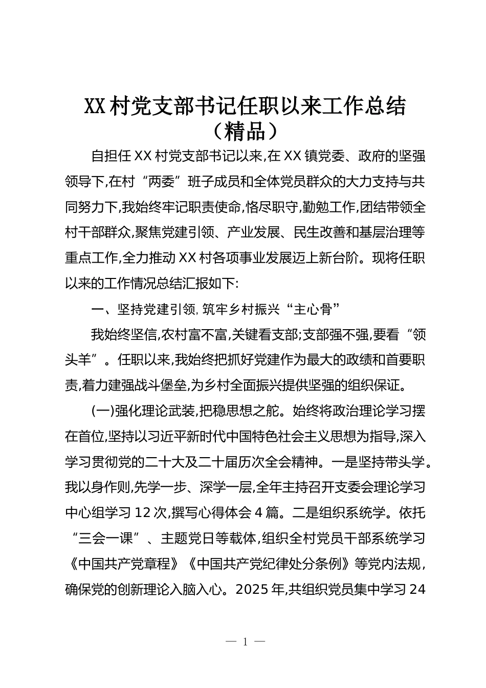 XX村黨支部書(shū)記任職以來(lái)工作總結(jié)(精品)