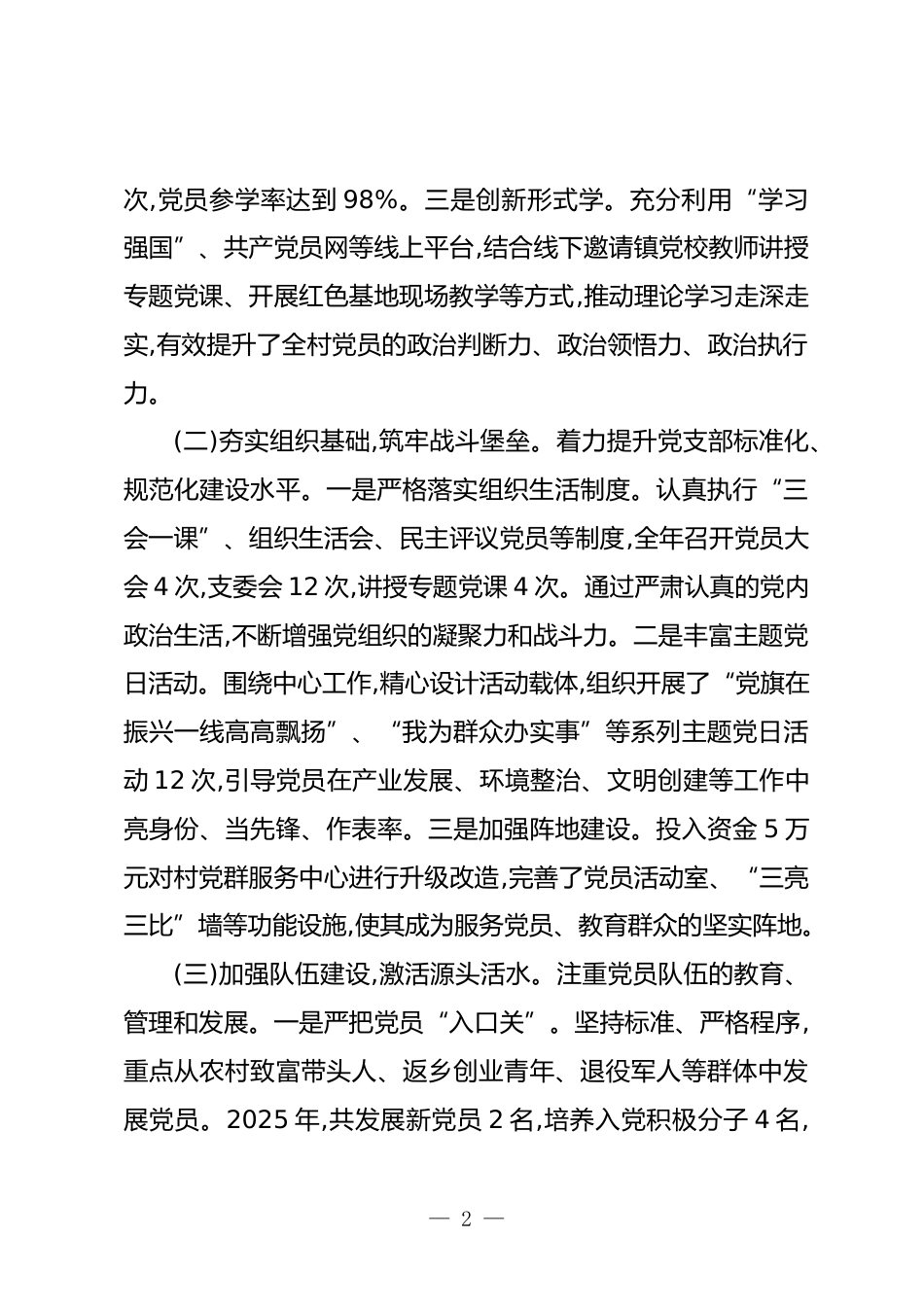 XX村黨支部書(shū)記任職以來(lái)工作總結(jié)(精品)自擔(dān)任XX村黨支部書(shū)記以來(lái),在XX鎮(zhèn)黨委、政府的堅(jiān)強(qiáng)領(lǐng)導(dǎo)下,在村“兩委”班子成員和全體黨員群眾的大力支持與共同努力下,我始終牢記職責(zé)使命,恪盡職守,勤勉工作,團(tuán)結(jié)帶領(lǐng)全村干部群眾,聚焦黨建引領(lǐng)、產(chǎn)業(yè)發(fā)展、民生改善和基層治理等重點(diǎn)工作,全力推動(dòng)XX村各項(xiàng)事業(yè)發(fā)展邁上新臺(tái)階?,F(xiàn)將任職以來(lái)的工作情況總結(jié)匯報(bào)如下:一、堅(jiān)持黨建引領(lǐng),筑牢鄉(xiāng)村振興“主心骨”我始終堅(jiān)信,農(nóng)村富不富,關(guān)鍵看支部;支部強(qiáng)不強(qiáng),要看“領(lǐng)頭羊”。任職以來(lái),我始終把抓好黨建作為最大的政績(jī)和首要職責(zé),著力建強(qiáng)戰(zhàn)斗堡壘,為鄉(xiāng)村全面振興提供堅(jiān)強(qiáng)的組織保證...