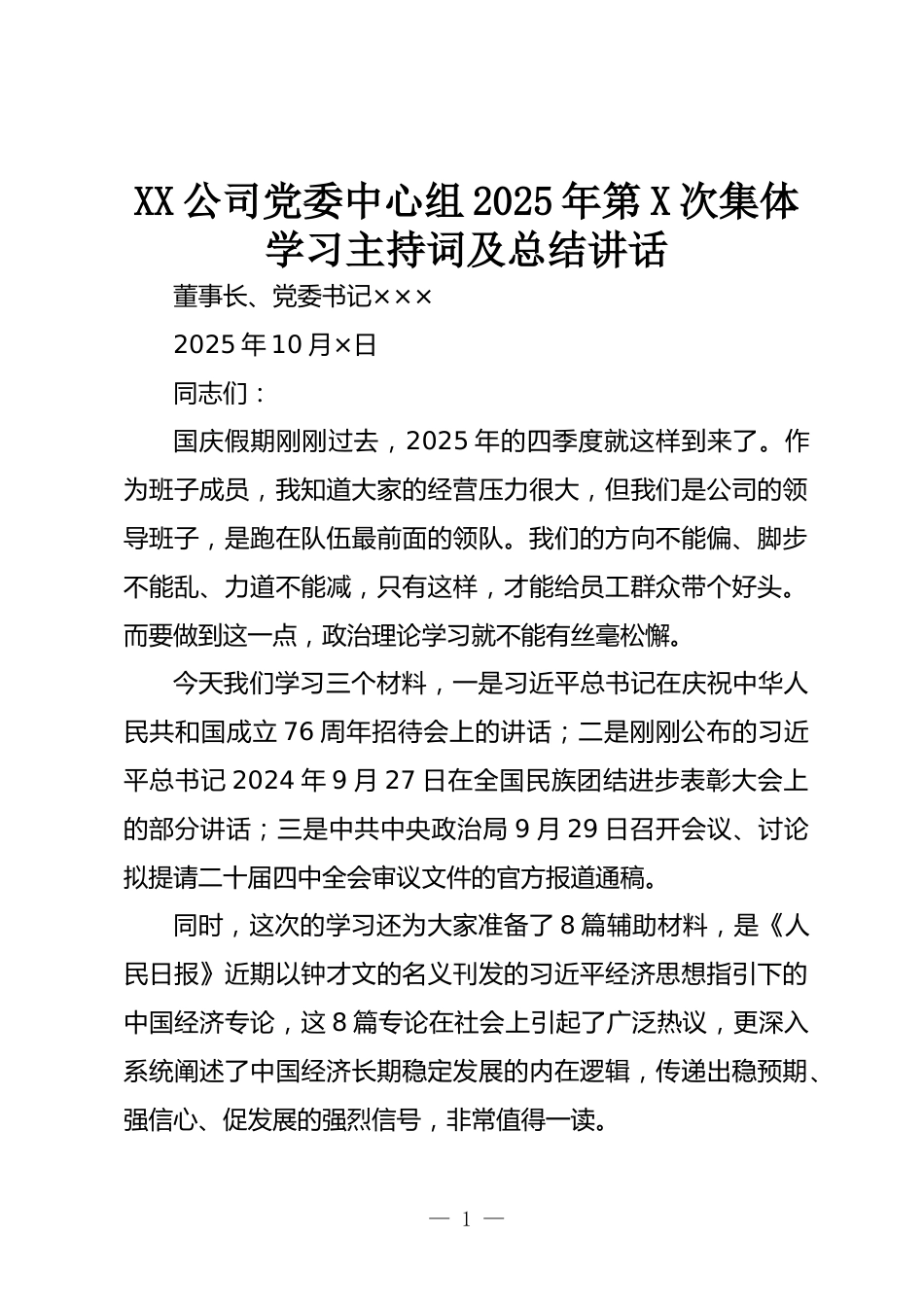 XX公司黨委中心組2025年第X次集體學(xué)習(xí)主持詞及總結(jié)講話
