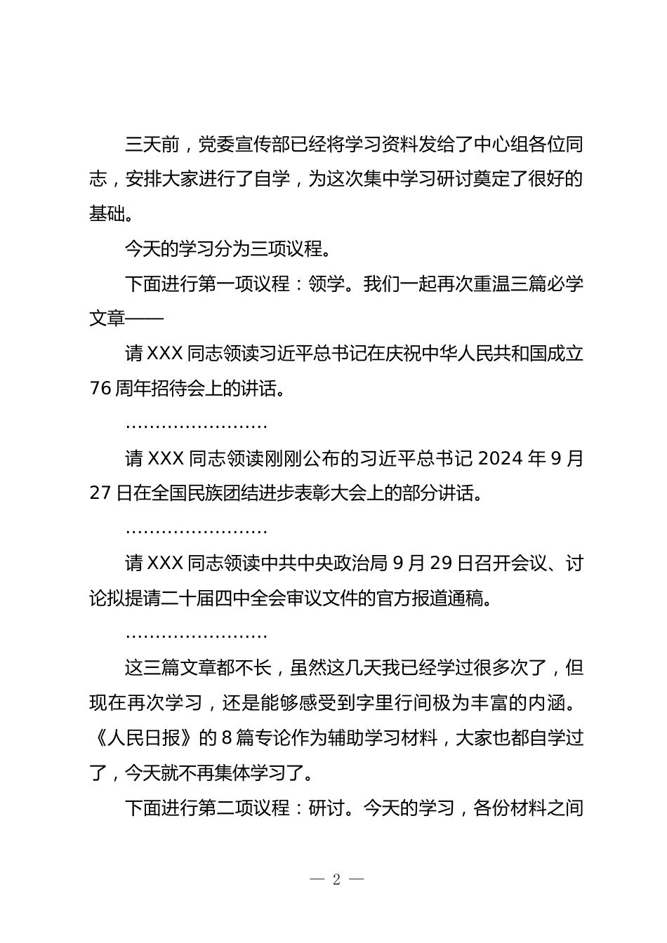 XX公司黨委中心組2025年第X次集體學(xué)習(xí)主持詞及總結(jié)講話董事長、黨委書記×××2025年10月×日同志們:國慶假期剛剛過去,2025年的四季度就這樣到來了。作為班子成員,我知道大家的經(jīng)營壓力很大,但我們是公司的領(lǐng)導(dǎo)班子,是跑在隊(duì)伍最前面的領(lǐng)隊(duì)。我們的方向不能偏、腳步不能亂、力道不能減,只有這樣,才能給員工群眾帶個(gè)好頭。而要做到這一點(diǎn),政治理論學(xué)習(xí)就不能有絲毫松懈。今天我們學(xué)習(xí)三個(gè)材料,一是習(xí)近平總書記在慶祝中華人民共和國成立76周年招待會上的講話;二是剛剛公布的習(xí)近平總書記2024年9月27日在全國民族團(tuán)結(jié)進(jìn)步表彰大會上的部分講話;三是中共中央政治...