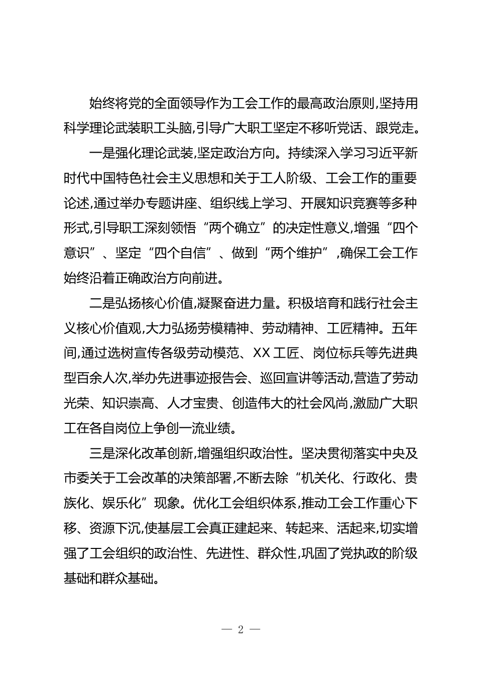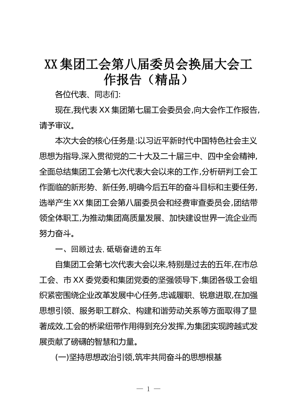 XX集團(tuán)工會(huì)第八屆委員會(huì)換屆大會(huì)工作報(bào)告(精品)各位代表、同志們:現(xiàn)在,我代表XX集團(tuán)第七屆工會(huì)委員會(huì),向大會(huì)作工作報(bào)告,請(qǐng)予審議。本次大會(huì)的核心任務(wù)是:以習(xí)近平新時(shí)代中國(guó)特色社會(huì)主義思想為指導(dǎo),深入貫徹黨的二十大及二十屆三中、四中全會(huì)精神,全面總結(jié)集團(tuán)工會(huì)第七次代表大會(huì)以來(lái)的工作,分析研判工會(huì)工作面臨的新形勢(shì)、新任務(wù),明確今后五年的奮斗目標(biāo)和主要任務(wù),選舉產(chǎn)生XX集團(tuán)工會(huì)第八屆委員會(huì)和經(jīng)費(fèi)審查委員會(huì),團(tuán)結(jié)帶領(lǐng)全體職工,為推動(dòng)集團(tuán)高質(zhì)量發(fā)展、加快建設(shè)世界一流企業(yè)而努力奮斗。一、回顧過(guò)去,砥礪奮進(jìn)的五年自集團(tuán)工會(huì)第七次代表大會(huì)以來(lái),特別是過(guò)去的五...