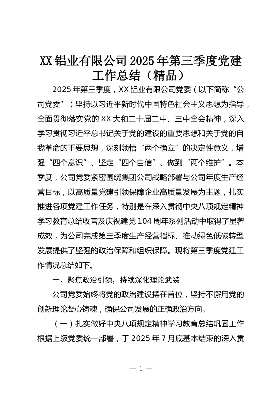 XX鋁業(yè)有限公司2025年第三季度黨建工作總結(jié)(精品)