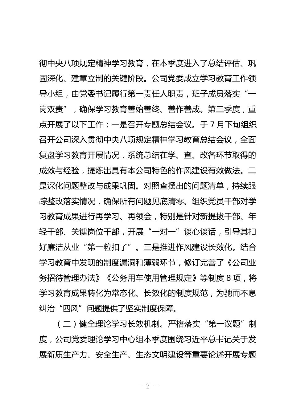 XX鋁業(yè)有限公司2025年第三季度黨建工作總結(jié)(精品)2025年第三季度,XX鋁業(yè)有限公司黨委(以下簡稱“公司黨委”)堅持以習(xí)近平新時代中國特色社會主義思想為指導(dǎo),全面貫徹落實黨的XX大和二十屆二中、三中全會精神,深入學(xué)習(xí)貫徹習(xí)近平總書記關(guān)于黨的建設(shè)的重要思想和關(guān)于黨的自我革命的重要思想,深刻領(lǐng)悟“兩個確立”的決定性意義,增強(qiáng)“四個意識”、堅定“四個自信”、做到“兩個維護(hù)”。本季度,公司黨委緊密圍繞集團(tuán)公司戰(zhàn)略部署與公司年度生產(chǎn)經(jīng)營目標(biāo),以高質(zhì)量黨建引領(lǐng)保障企業(yè)高質(zhì)量發(fā)展為主題,扎實推進(jìn)各項黨建工作任務(wù),特別是在深入貫徹中央八項規(guī)定精神學(xué)...