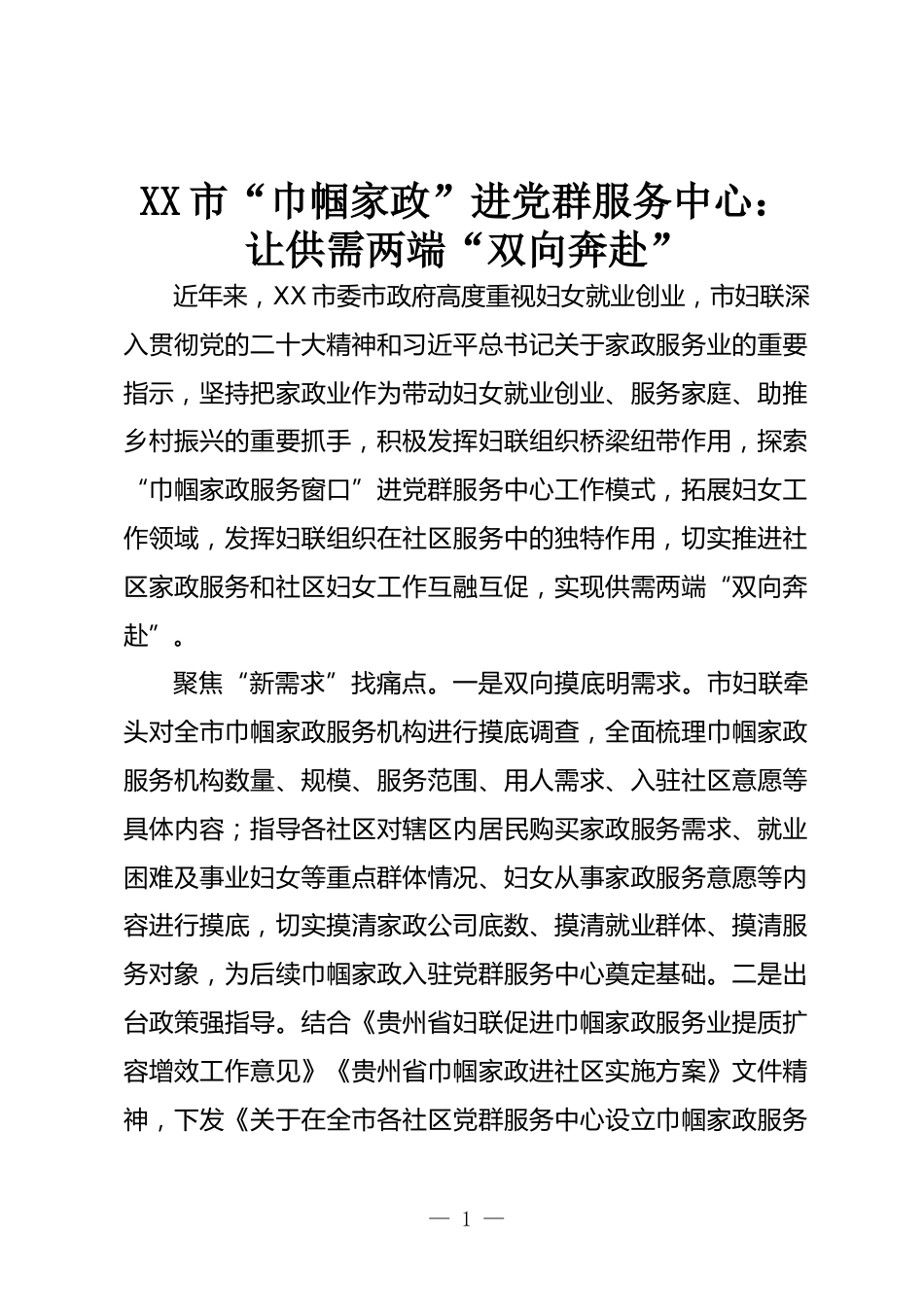XX市“巾幗家政”進(jìn)黨群服務(wù)中心:讓供需兩端“雙向奔赴”近年來(lái),XX市委市政府高度重視婦女就業(yè)創(chuàng)業(yè),市婦聯(lián)深入貫徹黨的二十大精神和習(xí)近平總書(shū)記關(guān)于家政服務(wù)業(yè)的重要指示,堅(jiān)持把家政業(yè)作為帶動(dòng)?jì)D女就業(yè)創(chuàng)業(yè)、服務(wù)家庭、助推鄉(xiāng)村振興的重要抓手,積極發(fā)揮婦聯(lián)組織橋梁紐帶作用,探索“巾幗家政服務(wù)窗口”進(jìn)黨群服務(wù)中心工作模式,拓展婦女工作領(lǐng)域,發(fā)揮婦聯(lián)組織在社區(qū)服務(wù)中的獨(dú)特作用,切實(shí)推進(jìn)社區(qū)家政服務(wù)和社區(qū)婦女工作互融互促,實(shí)現(xiàn)供需兩端“雙向奔赴”。聚焦“新需求”找痛點(diǎn)。一是雙向摸底明需求。市婦聯(lián)牽頭對(duì)全市巾幗家政服務(wù)機(jī)構(gòu)進(jìn)行摸底調(diào)查,全面梳理...