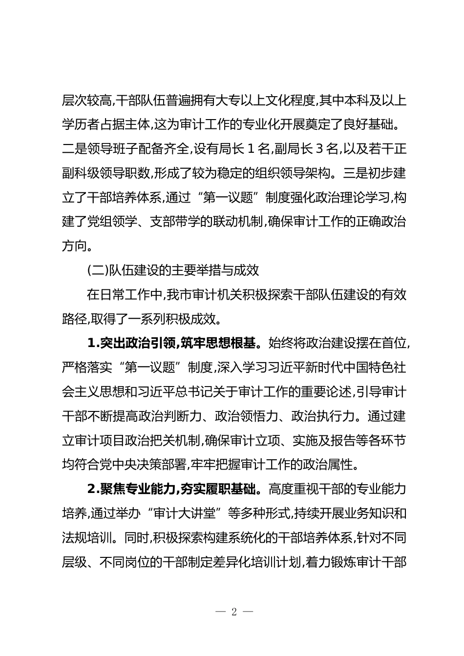 XX市審計局關(guān)于新時代審計干部隊伍建設(shè)情況的調(diào)研報告為深入貫徹習(xí)近平總書記關(guān)于審計工作的重要指示批示精神,落實新時代黨的建設(shè)總要求和新時代黨的組織路線,全面加強(qiáng)我市審計干部隊伍建設(shè),XX市審計局近期組織開展了全市審計干部隊伍建設(shè)專題調(diào)研。本次調(diào)研旨在全面梳理當(dāng)前我市審計干部隊伍建設(shè)現(xiàn)狀,深入分析隊伍在結(jié)構(gòu)、能力、培養(yǎng)等方面存在的短板與不足,并結(jié)合新時代審計工作的新形勢、新任務(wù)、新要求,提出針對性、可操作性的意見建議,為鍛造一支政治過硬、本領(lǐng)高強(qiáng)、作風(fēng)優(yōu)良、紀(jì)律嚴(yán)明的高素質(zhì)專業(yè)化審計鐵軍提供決策參考。一、全市審計干部隊伍建設(shè)基本現(xiàn)狀與初...