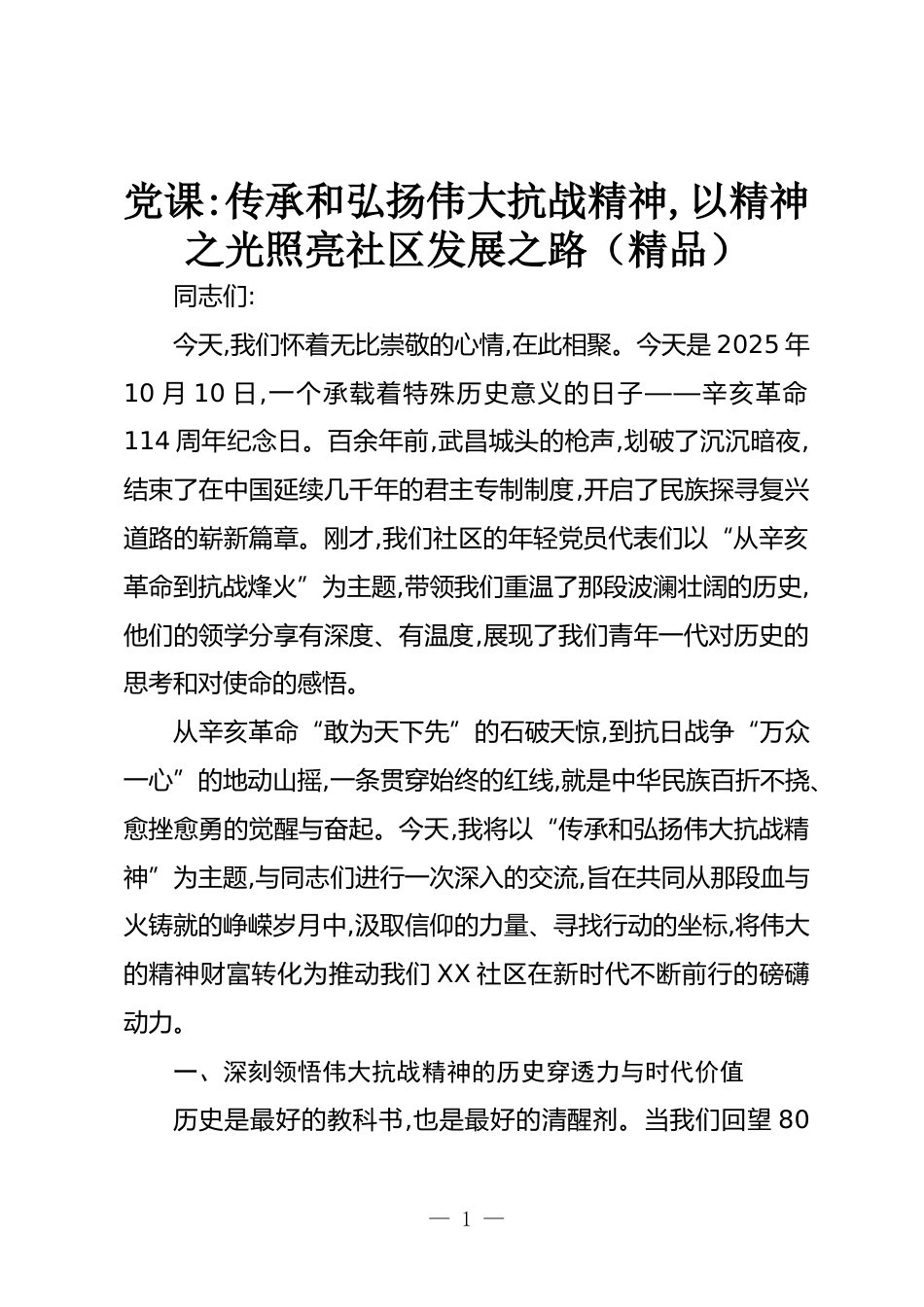 黨課:傳承和弘揚(yáng)偉大抗戰(zhàn)精神,以精神之光照亮社區(qū)發(fā)展之路(精品)同志們:今天,我們懷著無比崇敬的心情,在此相聚。今天是2025年10月10日,一個承載著特殊歷史意義的日子——辛亥革命114周年紀(jì)念日。百余年前,武昌城頭的槍聲,劃破了沉沉暗夜,結(jié)束了在中國延續(xù)幾千年的君主專制制度,開啟了民族探尋復(fù)興道路的嶄新篇章。剛才,我們社區(qū)的年輕黨員代表們以“從辛亥革命到抗戰(zhàn)烽火”為主題,帶領(lǐng)我們重溫了那段波瀾壯闊的歷史,他們的領(lǐng)學(xué)分享有深度、有溫度,展現(xiàn)了我們青年一代對歷史的思考和對使命的感悟。從辛亥革命“敢為天下先”的石破天驚,到抗日戰(zhàn)爭“萬眾一心”的地動山搖...