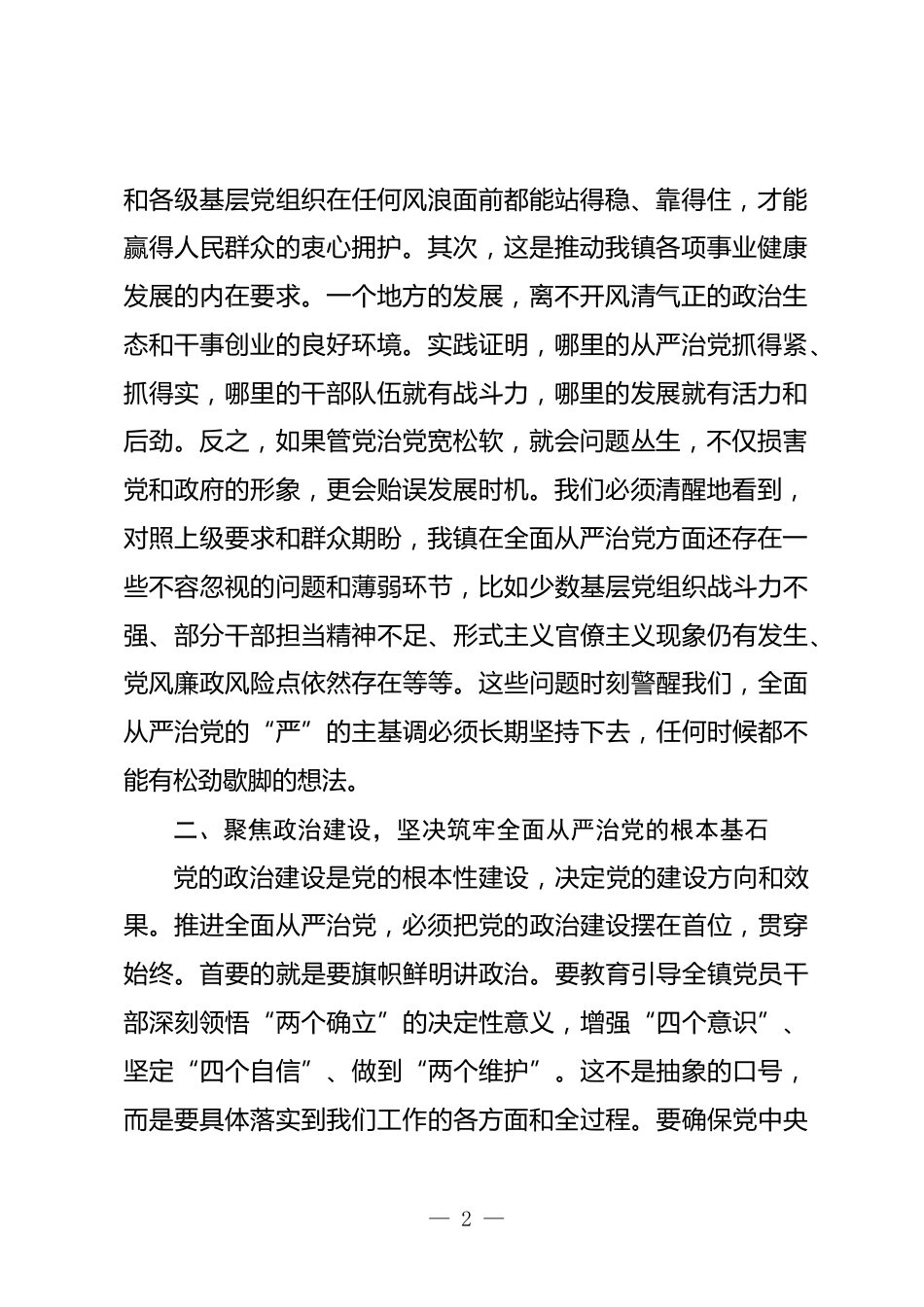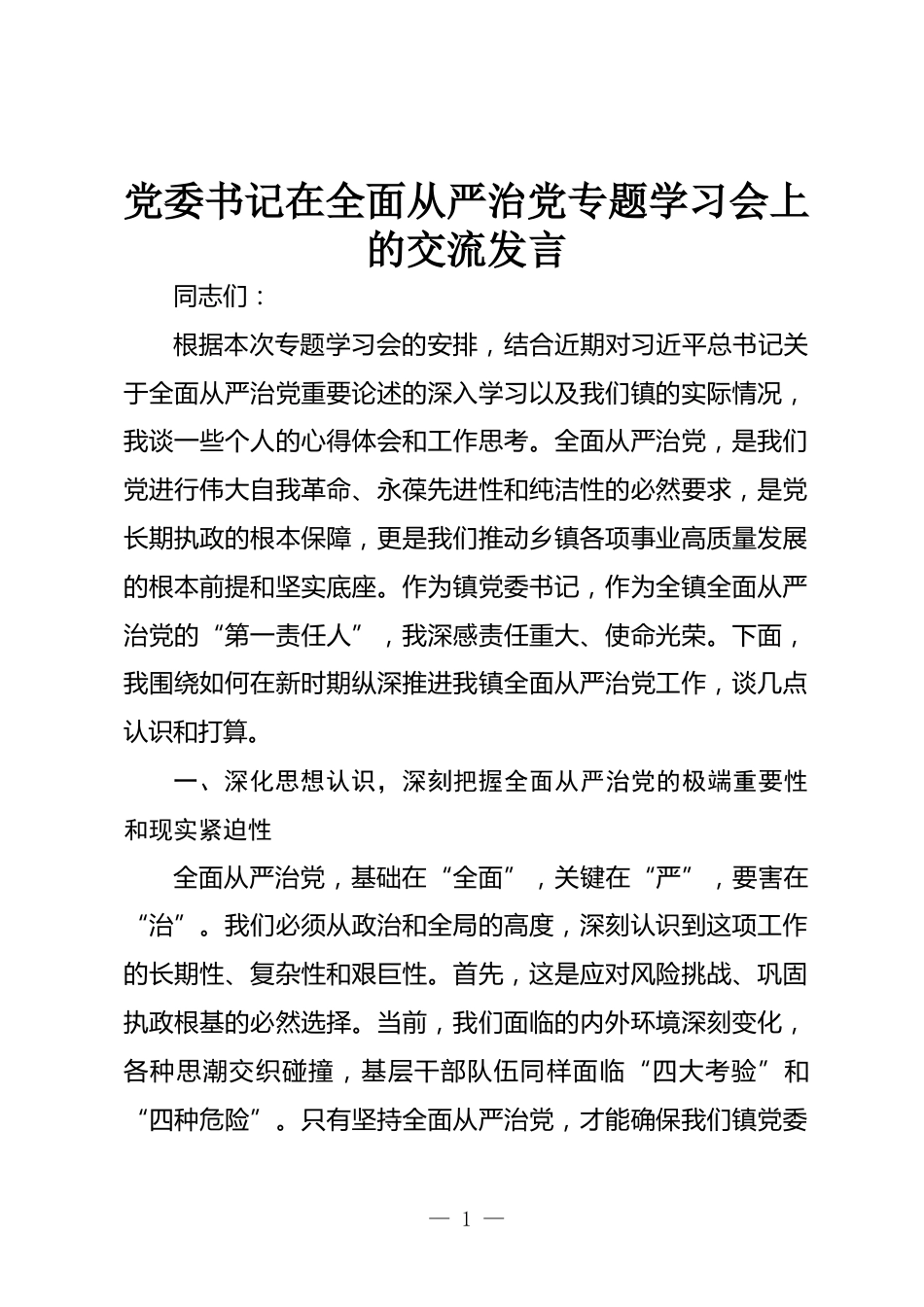 黨委書記在全面從嚴治黨專題學(xué)習(xí)會上的交流發(fā)言同志們:根據(jù)本次專題學(xué)習(xí)會的安排,結(jié)合近期對習(xí)近平總書記關(guān)于全面從嚴治黨重要論述的深入學(xué)習(xí)以及我們鎮(zhèn)的實際情況,我談一些個人的心得體會和工作思考。全面從嚴治黨,是我們黨進行偉大自我革命、永葆先進性和純潔性的必然要求,是黨長期執(zhí)政的根本保障,更是我們推動鄉(xiāng)鎮(zhèn)各項事業(yè)高質(zhì)量發(fā)展的根本前提和堅實底座。作為鎮(zhèn)黨委書記,作為全鎮(zhèn)全面從嚴治黨的“第一責(zé)任人”,我深感責(zé)任重大、使命光榮。下面,我圍繞如何在新時期縱深推進我鎮(zhèn)全面從嚴治黨工作,談幾點認識和打算。一、深化思想認識,深刻把握全面從嚴治黨...