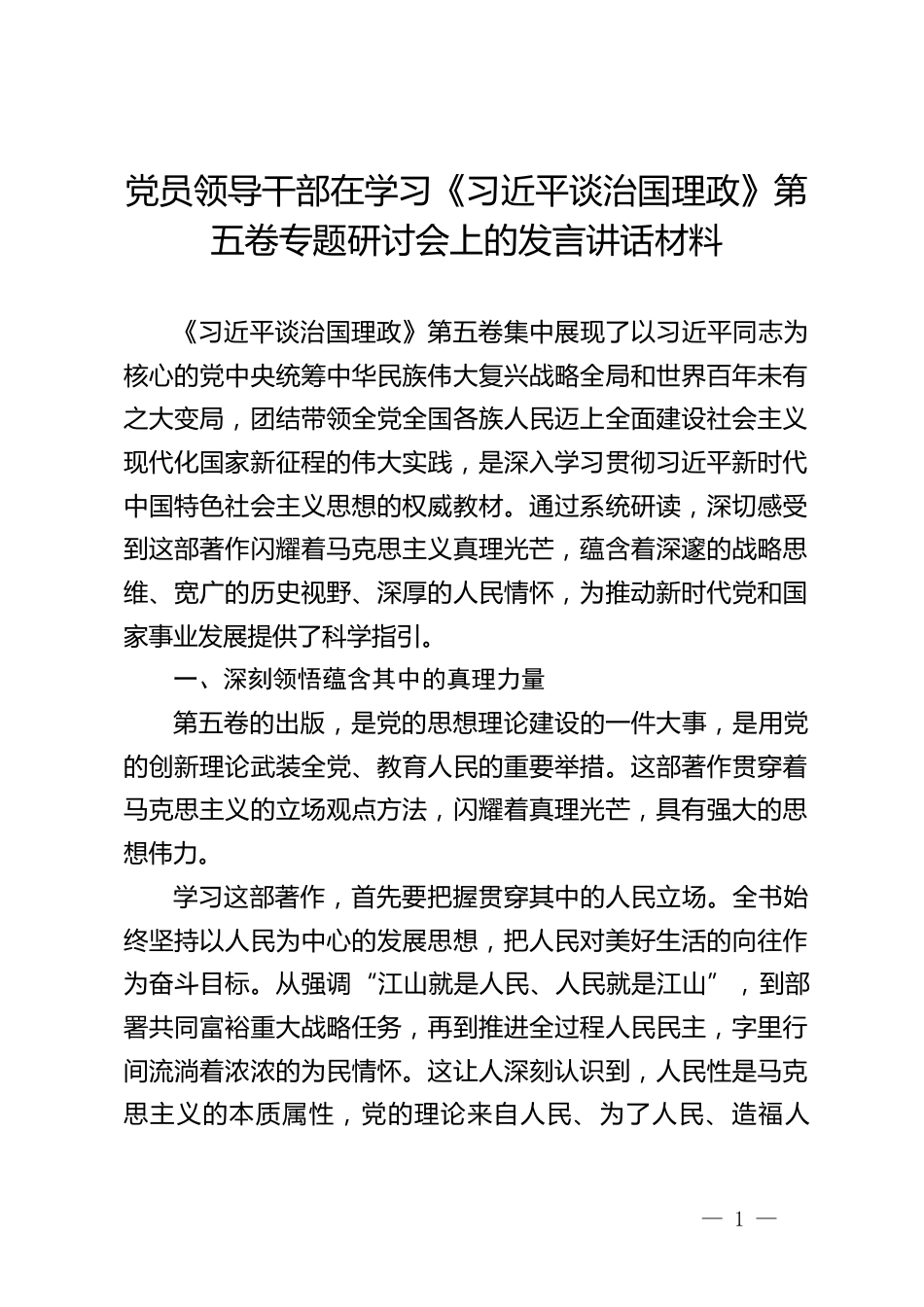 黨員領(lǐng)導(dǎo)干部在學(xué)習(xí)《習(xí)近平談治國理政》第五卷專題研討會上的發(fā)言講話材料
