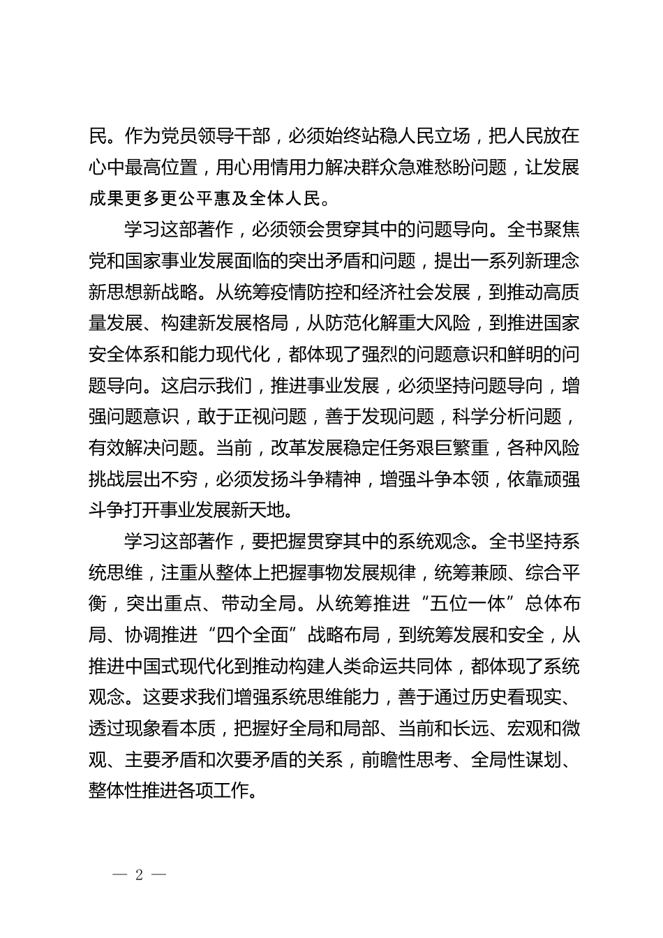 黨員領(lǐng)導(dǎo)干部在學(xué)習(xí)《習(xí)近平談治國理政》第五卷專題研討會上的發(fā)言講話材料《習(xí)近平談治國理政》第五卷集中展現(xiàn)了以習(xí)近平同志為核心的黨中央統(tǒng)籌中華民族偉大復(fù)興戰(zhàn)略全局和世界百年未有之大變局,團結(jié)帶領(lǐng)全黨全國各族人民邁上全面建設(shè)社會主義現(xiàn)代化國家新征程的偉大實踐,是深入學(xué)習(xí)貫徹習(xí)近平新時代中國特色社會主義思想的權(quán)威教材。通過系統(tǒng)研讀,深切感受到這部著作閃耀著馬克思主義真理光芒,蘊含著深邃的戰(zhàn)略思維、寬廣的歷史視野、深厚的人民情懷,為推動新時代黨和國家事業(yè)發(fā)展提供了科學(xué)指引。一、深刻領(lǐng)悟蘊含其中的真理力量第五卷的出版,是黨的思想理論建...