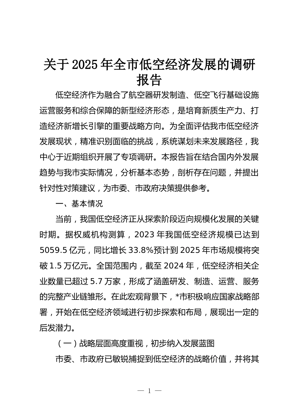 關(guān)于2025年全市低空經(jīng)濟(jì)發(fā)展的調(diào)研報(bào)告低空經(jīng)濟(jì)作為融合了航空器研發(fā)制造、低空飛行基礎(chǔ)設(shè)施運(yùn)營(yíng)服務(wù)和綜合保障的新型經(jīng)濟(jì)形態(tài),是培育新質(zhì)生產(chǎn)力、打造經(jīng)濟(jì)新增長(zhǎng)引擎的重要戰(zhàn)略方向。為全面評(píng)估我市低空經(jīng)濟(jì)發(fā)展現(xiàn)狀,精準(zhǔn)識(shí)別面臨的挑戰(zhàn),系統(tǒng)謀劃未來(lái)發(fā)展路徑,我中心于近期組織開(kāi)展了專項(xiàng)調(diào)研。本報(bào)告旨在結(jié)合國(guó)內(nèi)外發(fā)展趨勢(shì)與我市實(shí)際情況,分析基本態(tài)勢(shì),剖析存在問(wèn)題,并提出針對(duì)性對(duì)策建議,為市委、市政府決策提供參考。一、基本情況當(dāng)前,我國(guó)低空經(jīng)濟(jì)正從探索階段邁向規(guī)?;l(fā)展的關(guān)鍵時(shí)期。據(jù)權(quán)威機(jī)構(gòu)測(cè)算,2023年我國(guó)低空經(jīng)濟(jì)規(guī)模已達(dá)到5059.5億元,同比增...