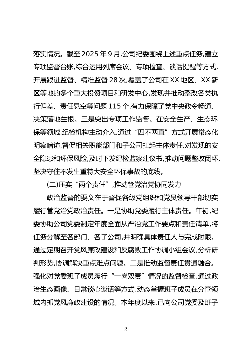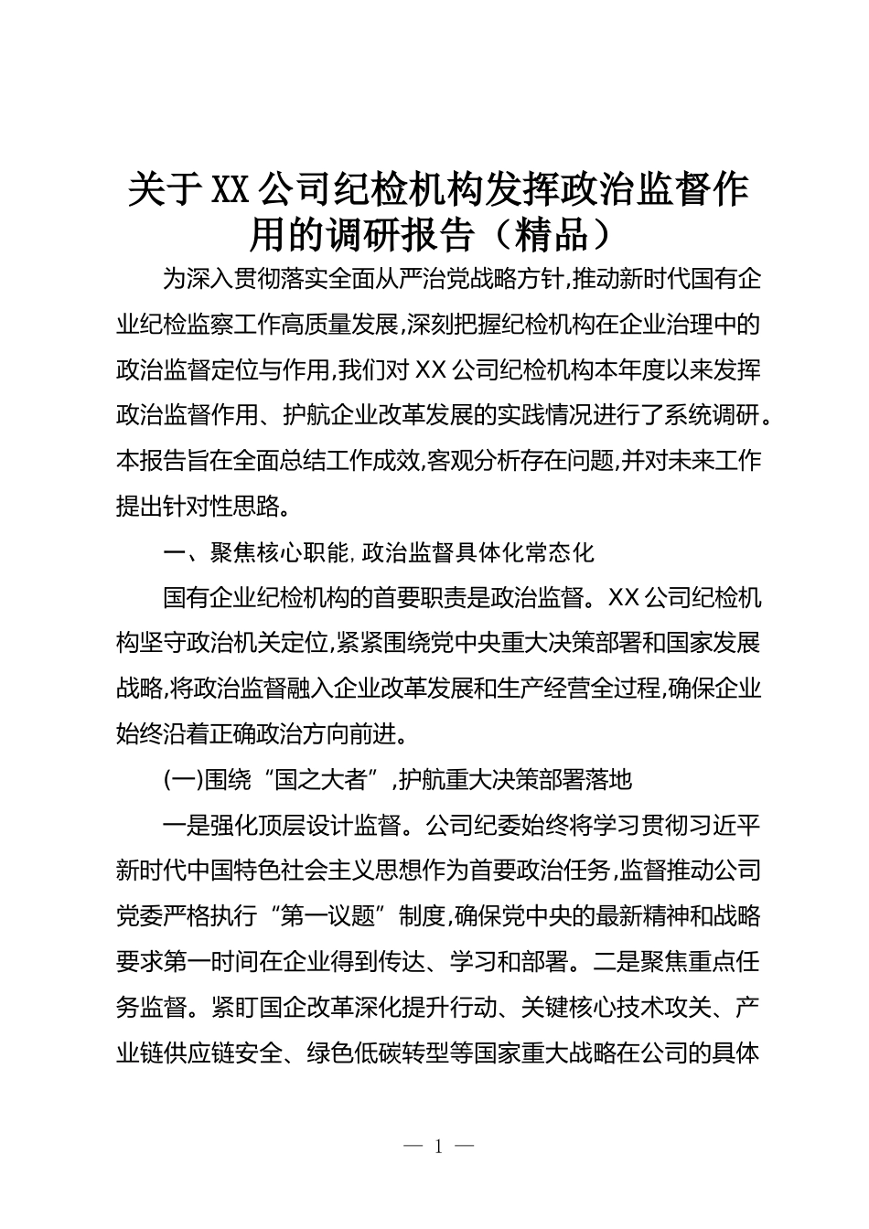 關(guān)于XX公司紀(jì)檢機(jī)構(gòu)發(fā)揮政治監(jiān)督作用的調(diào)研報(bào)告(精品)為深入貫徹落實(shí)全面從嚴(yán)治黨戰(zhàn)略方針,推動(dòng)新時(shí)代國有企業(yè)紀(jì)檢監(jiān)察工作高質(zhì)量發(fā)展,深刻把握紀(jì)檢機(jī)構(gòu)在企業(yè)治理中的政治監(jiān)督定位與作用,我們對(duì)XX公司紀(jì)檢機(jī)構(gòu)本年度以來發(fā)揮政治監(jiān)督作用、護(hù)航企業(yè)改革發(fā)展的實(shí)踐情況進(jìn)行了系統(tǒng)調(diào)研。本報(bào)告旨在全面總結(jié)工作成效,客觀分析存在問題,并對(duì)未來工作提出針對(duì)性思路。一、聚焦核心職能,政治監(jiān)督具體化常態(tài)化國有企業(yè)紀(jì)檢機(jī)構(gòu)的首要職責(zé)是政治監(jiān)督。XX公司紀(jì)檢機(jī)構(gòu)堅(jiān)守政治機(jī)關(guān)定位,緊緊圍繞黨中央重大決策部署和國家發(fā)展戰(zhàn)略,將政治監(jiān)督融入企業(yè)改革發(fā)展和生產(chǎn)經(jīng)營全過程,...