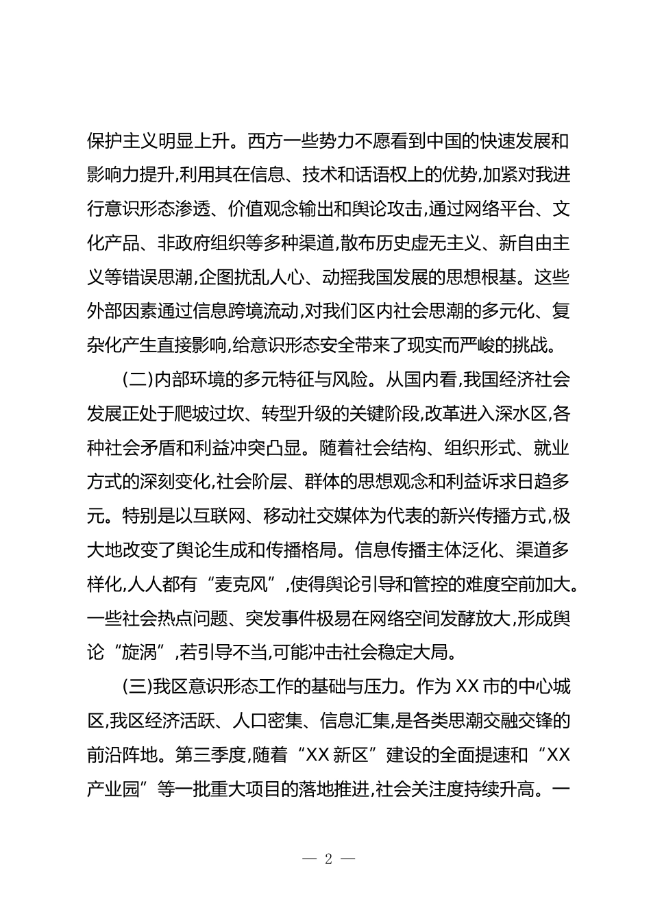 關(guān)于XX區(qū)2025年第三季度意識(shí)形態(tài)工作的調(diào)研報(bào)告(精品)根據(jù)區(qū)委工作部署,區(qū)委政研室于2025年9月下旬至10月初,通過實(shí)地走訪、座談交流、數(shù)據(jù)分析等方式,對(duì)我區(qū)2025年第三季度意識(shí)形態(tài)工作情況進(jìn)行了專題調(diào)研?,F(xiàn)將有關(guān)情況報(bào)告如下。2025年第三季度,在區(qū)委的堅(jiān)強(qiáng)領(lǐng)導(dǎo)下,全區(qū)各級(jí)黨組織堅(jiān)持以黨的創(chuàng)新理論為指導(dǎo),深入貫徹落實(shí)中央、省委和市委關(guān)于意識(shí)形態(tài)工作的決策部署,牢牢把握正確政治方向、輿論導(dǎo)向和價(jià)值取向,全面落實(shí)意識(shí)形態(tài)工作責(zé)任制,理論武裝持續(xù)深化,主流輿論不斷壯大,陣地管理規(guī)范有序,風(fēng)險(xiǎn)防范精準(zhǔn)有力,意識(shí)形態(tài)領(lǐng)域總體保持了向上向好、平穩(wěn)可控的良好態(tài)勢(shì)...