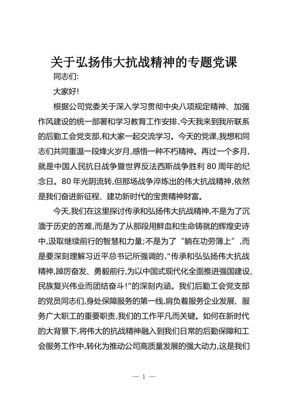 關(guān)于弘揚(yáng)偉大抗戰(zhàn)精神的專(zhuān)題黨課同志們:大家好!根據(jù)公司黨委關(guān)于深入學(xué)習(xí)貫徹中央八項(xiàng)規(guī)定精神、加強(qiáng)作風(fēng)建設(shè)的統(tǒng)一部署和學(xué)習(xí)教育工作安排,今天我來(lái)到我所聯(lián)系的后勤工會(huì)黨支部,和大家一起交流學(xué)習(xí)。今天的黨課,我想和同志們共同重溫一段烽火歲月,感悟一種不朽精神。再過(guò)一個(gè)多月,就是中國(guó)人民抗日戰(zhàn)爭(zhēng)暨世界反法西斯戰(zhàn)爭(zhēng)勝利80周年的紀(jì)念日。80年光陰流轉(zhuǎn),但那場(chǎng)戰(zhàn)爭(zhēng)淬煉出的偉大抗戰(zhàn)精神,依然是我們奮進(jìn)新征程、建功新時(shí)代的寶貴精神財(cái)富。今天,我們?cè)谶@里探討傳承和弘揚(yáng)偉大抗戰(zhàn)精神,不是為了沉湎于歷史的苦難,而是為了從那段用鮮血和生命鑄就的輝煌史詩(shī)中,汲取繼續(xù)...