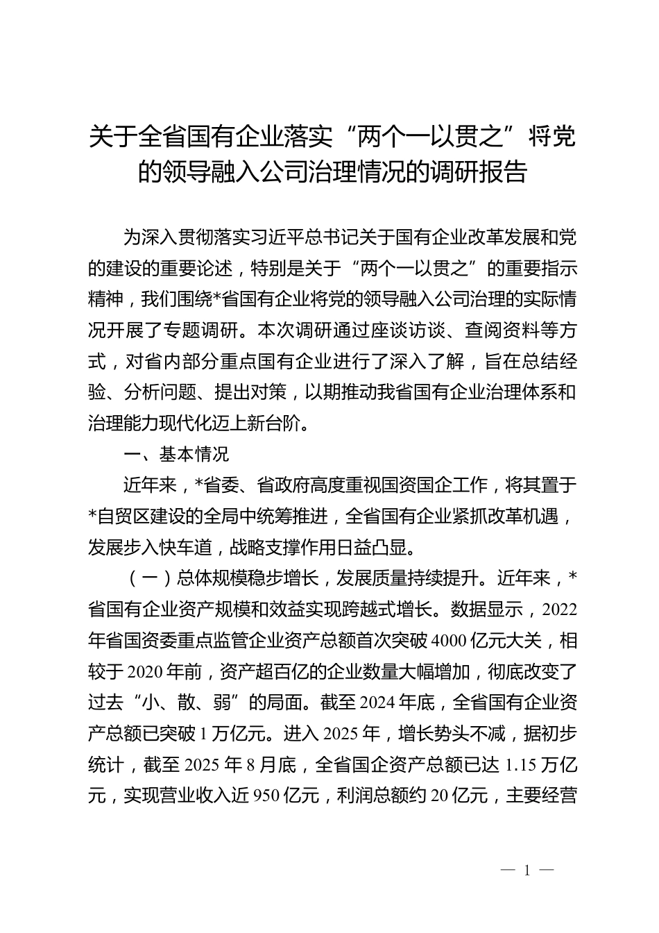關(guān)于全省國有企業(yè)落實“兩個一以貫之”將黨的領(lǐng)導(dǎo)融入公司治理情況的調(diào)研報告