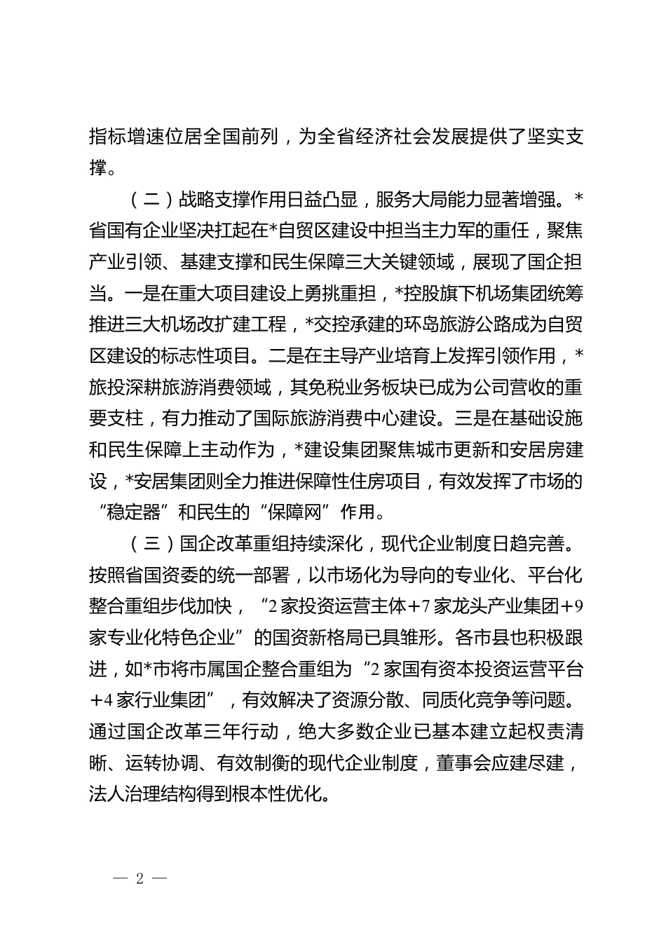 關(guān)于全省國有企業(yè)落實“兩個一以貫之”將黨的領(lǐng)導(dǎo)融入公司治理情況的調(diào)研報告為深入貫徹落實習(xí)近平總書記關(guān)于國有企業(yè)改革發(fā)展和黨的建設(shè)的重要論述,特別是關(guān)于“兩個一以貫之”的重要指示精神,我們圍繞*省國有企業(yè)將黨的領(lǐng)導(dǎo)融入公司治理的實際情況開展了專題調(diào)研。本次調(diào)研通過座談訪談、查閱資料等方式,對省內(nèi)部分重點國有企業(yè)進(jìn)行了深入了解,旨在總結(jié)經(jīng)驗、分析問題、提出對策,以期推動我省國有企業(yè)治理體系和治理能力現(xiàn)代化邁上新臺階。一、基本情況近年來,*省委、省政府高度重視國資國企工作,將其置于*自貿(mào)區(qū)建設(shè)的全局中統(tǒng)籌推進(jìn),全省國有企業(yè)緊抓改革機(jī)...